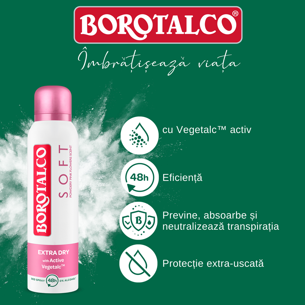 - formula sa, imbogatita cu inovatorul VegetalcTM Activ, un amestec de pulberi absorbante de origine vegetala, ofera o tripla protectie impotriva transpiratiei si un efect de piele extra uscata;