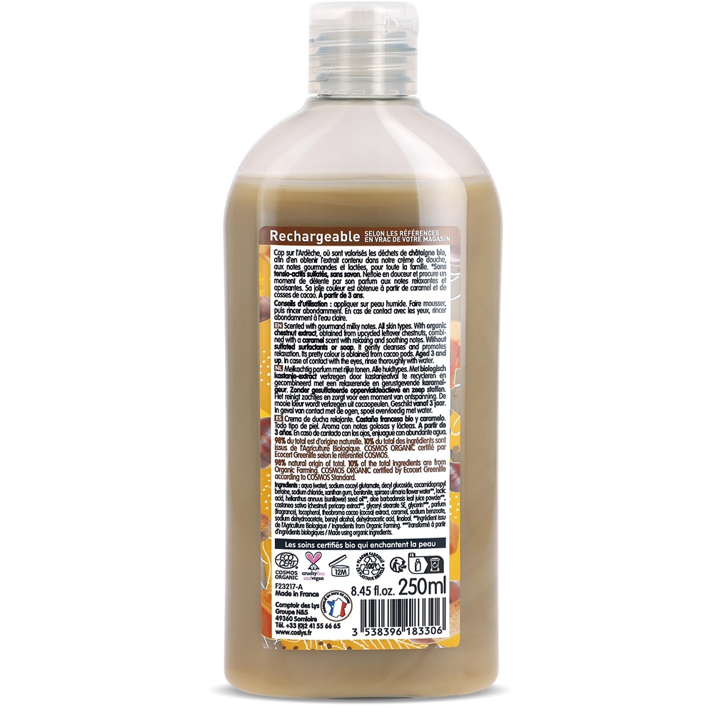Ingrediente:Apa, cocoil glutamat de sodiu, decil glucozida, cocamidopropil betaina, clorura de sodiu, guma xantan, bentonita, apa de flori de Spiraea Ulmaria(cretusca)**, acid lactic, ulei din seminte de floarea-soarelui**, pudra din suc de frunze de Aloe Barbadensis(aloe vera)**, extract de pericarp de Castanea Sativa (castan)**, stearat de gliceril, glicerina, parfum, tocoferol, extract de cacao, caramel, benzoat de sodiu, dehidroacetat de sodiu, alcool benzilic, acid dehidroacetic, linalol. (**Ingrediente provenite din agricultura ecologica) 98% din totalul ingredientelor sunt de origine naturala, 10% din totalul ingredientelor sunt provenite din agricultura ecologica.