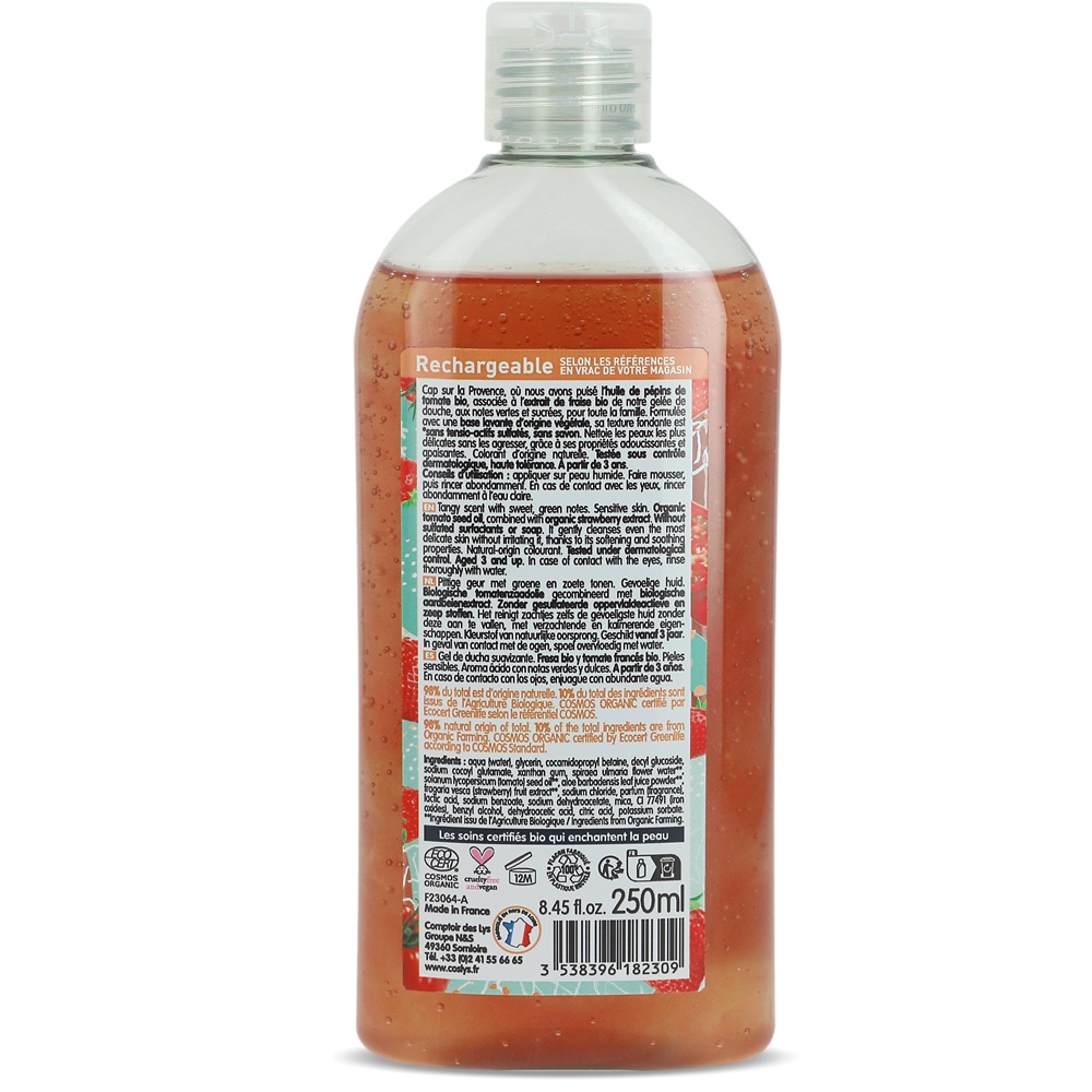 Ingrediente:Apa, glicerina, cocamidopropil betaina, decil glucozida, cocoil glutamat de sodiu, guma xantan, apa de flori de Spiraea Ulmaria(cretusca)**, ulei din seminte de Solanum Lycopersicum (rosii)**, pudra din suc de frunze de Aloe Barbadensis(aloe vera)**, extract de capsuni**, clorura de sodiu, parfum, acid lactic, benzoat de sodiu, dehidroacetat de sodiu, mica, CI 77491 (oxizi de fier), alcool benzilic, acid dehidroacetic, acid citric, sorbat de potasiu. (**Ingrediente provenite din agricultura ecologica) 98% din totalul ingredientelor sunt de origine naturala, 10% din totalul ingredientelor sunt provenite din agricultura ecologica.