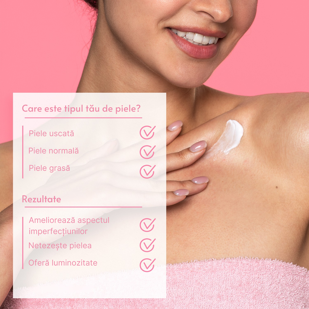 Imbunatateste textura pielii, lasand-o vizibil mai neteda si mai supla.