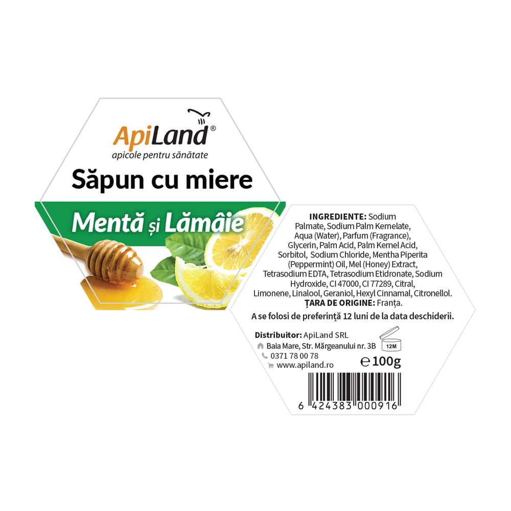 Palmat de sodiu, Palmat de sodiu kernelate, Apă, Parfum, Glicerină, Palm Acid-Sorbitol, Palm Kernel Acid, Clorura de sodiu, Ulei de mentă, Miere, Tetrasodium Etidronate, Sodium Hydroxide, Tetrasodium EDTA-CI47005,CI77289, Citral, Lămâie, Linalool, Geraniol, Hexyl Cinnamal, Citronellol.