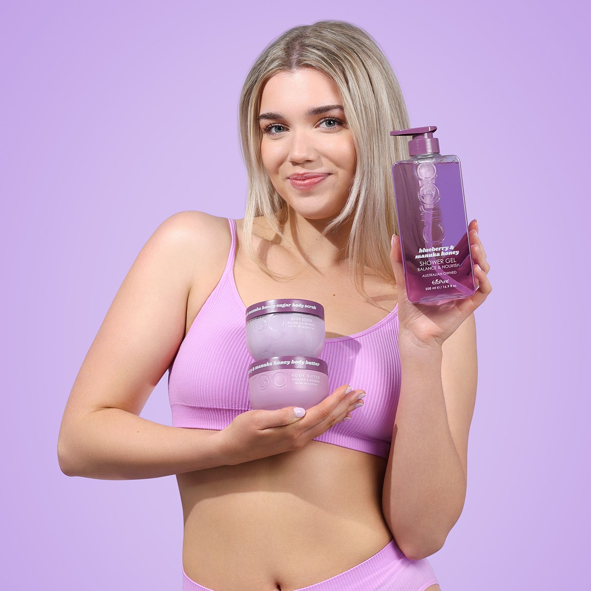 O formula cu vitamine si antioxidanti din extractul de afine care protejeaza corpul, mierea de Manuka care calmeaza, plus untul hranitor de shea si glicerina, totul imbogatit cu un parfum dulce de fructe de padure si miere catifelata.