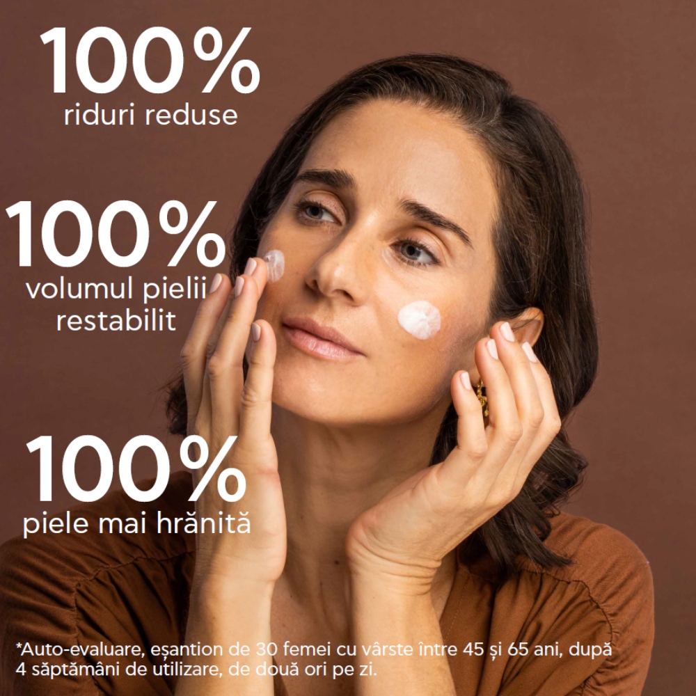 - reduce ridurile, creste densitatea si fermitatea pielii si redefineste conturul fetei cu laptisor de matca cu eliberare controlata si doua extracte puternice din plante;