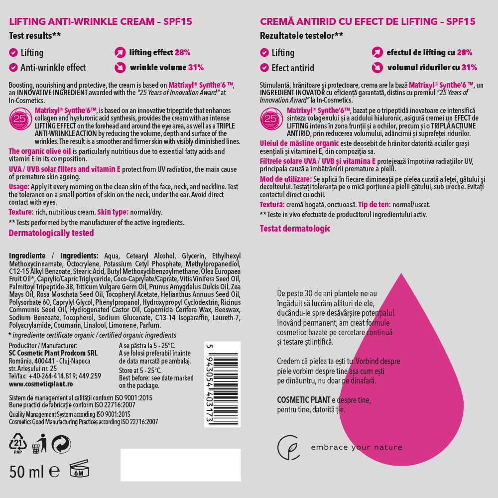 - bazat pe o tripeptida inovatoare ce intensifica sinteza colagenului şi al acidului hialuronic, asigura cremei o tripla actiune antirid prin reducerea volumului, adancimii si suprafetei ridurilor;
