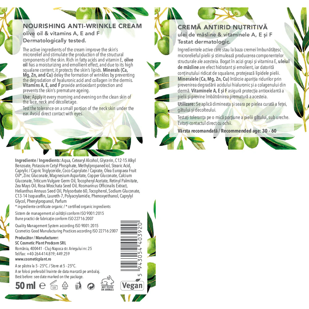 - combina actiunea emolienta a uleiului de masline cu actiunea anti-imbatranire a complexului de vitamine A, E si F;