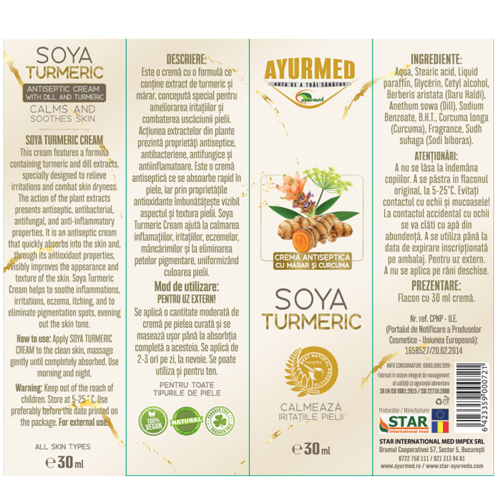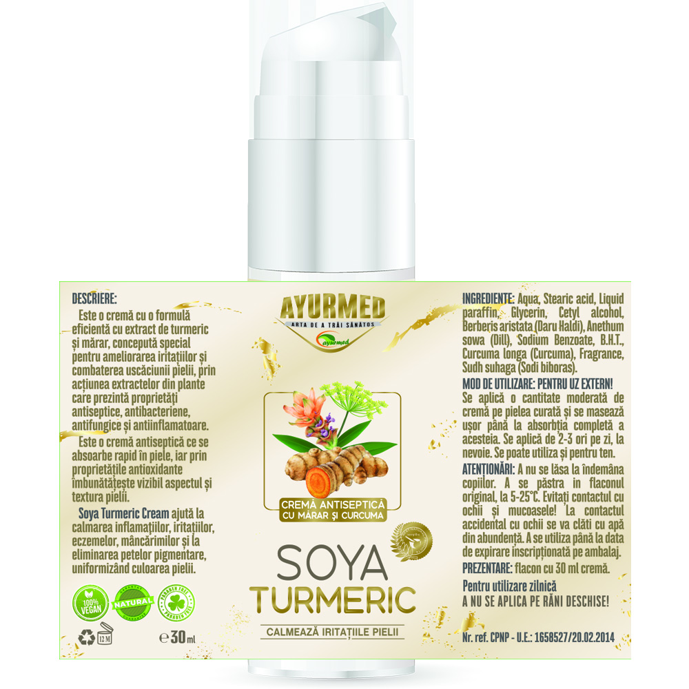 - Soya Turmeric Cream ajuta la calmarea inflamatiilor, iritatiilor, eczemelor, mancarimilor si la eliminarea petelor pigmentare, uniformizand culoarea pielii;