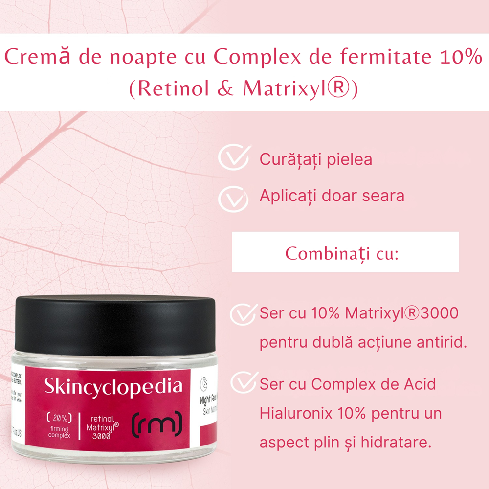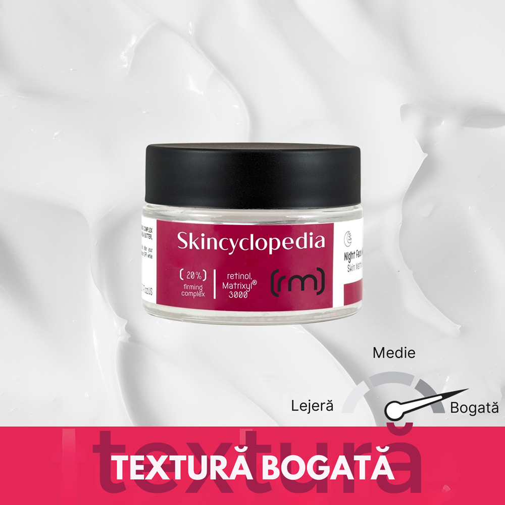 - crema de fata SKINCYCLOPEDIA cu 20% complex pentru fermitate este o formula avansata, special conceputa pentru utilizare pe timp de noapte, avand un efect vizibil de imbunatatire a fermitatii, texturii si luminozitatii pielii;