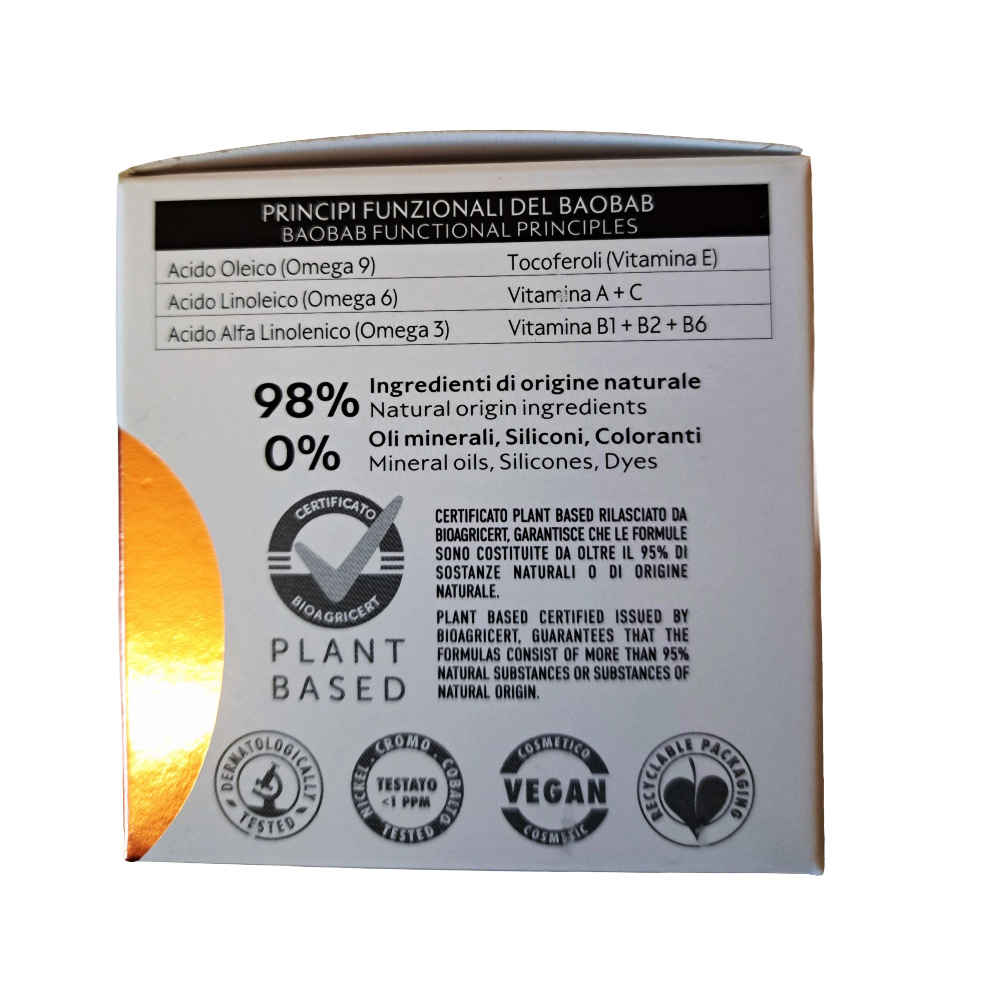 Ingrediente:Aqua [Water], C15-19 alkane, Glycerin, Betaine, Cetyl alcohol, Adansonia digitata seed oil (*), Butyrospermum parkii (Shea) butter, Potassium cetyl phosphate, Behenyl alcohol, Leontopodium alpinum callus culture extract, Camelina sativa seed oil, Bakuchiol, Sodium hyaluronate, Tocopherol, Retinyl palmitate, Tocopheryl acetate, Glycine soja (Soybean) oil, Sodium PCA, Hydrolyzed wheat protein, ascorbyl isostearate, Squalene, Beta-sitosterol, Lysine, Urea, Allantoin, Parfum [Fragrance], Sodium gluconate, Lactic acid, Xanthan gum, Olus oil [Vegetable (Olus) oil], Sorbitol, Vanillin, Pogostemon cablin oil, Tetramethyl acetyloctahydronaphthalenes, Coumarin, Linalool, Acetyl cedrene, Dehydroacetic acid, Polyacrylate crosspolymer-6, Benzoic acid, Phenoxyethanol.