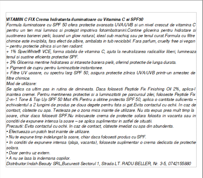 Precautii:Evitati contactul cu ochii. In caz de contact, clatiti bine cu apa. Efectuati un test de toleranta pe o portiune mica de piele inainte de utilizare. Nu stati prea mult timp in soare, chiar daca folositi un produs cu protectie solara.