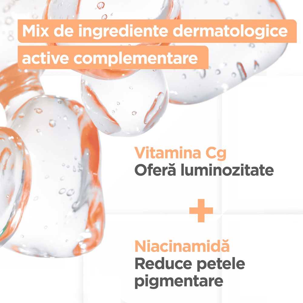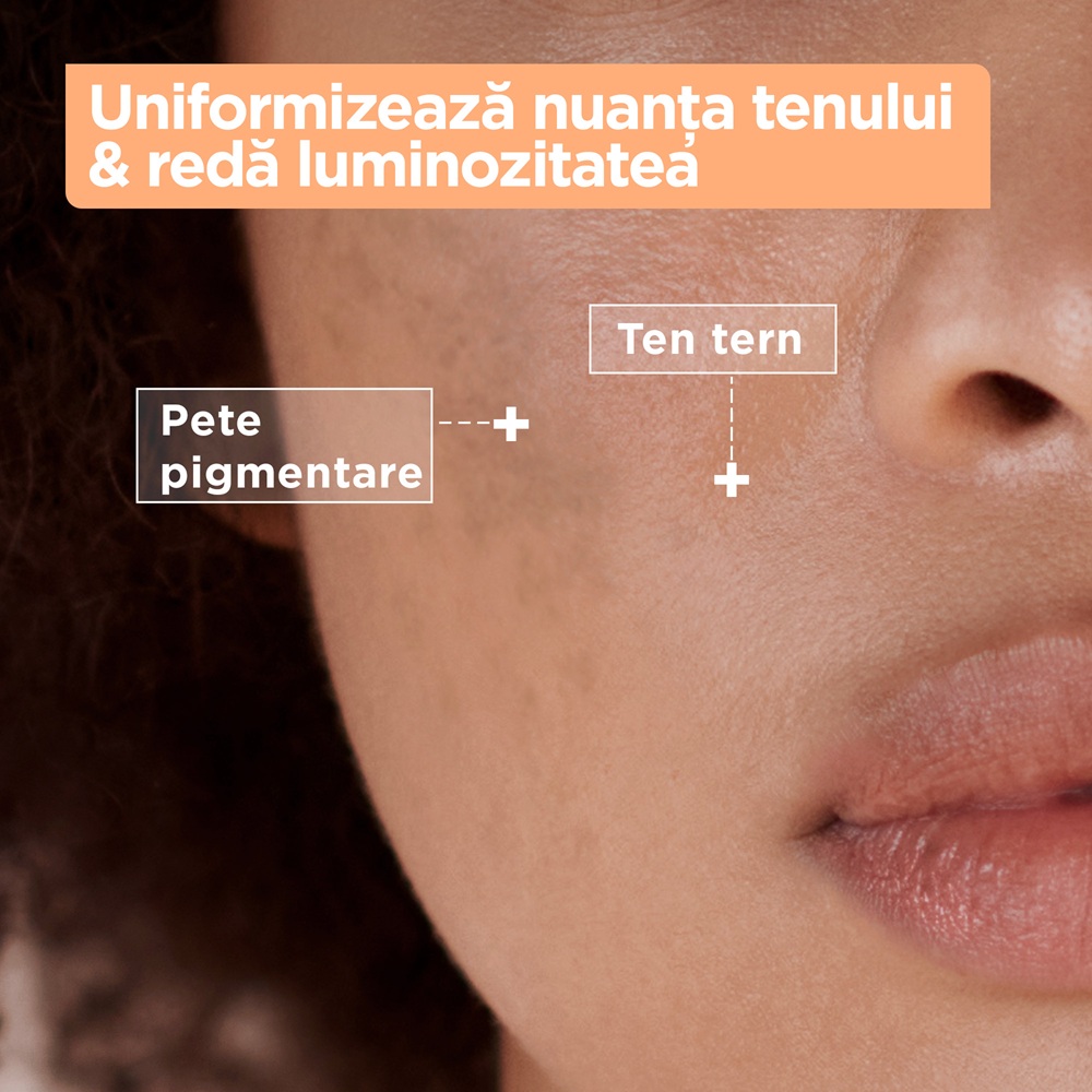 - niacinamida este recunoscuta pentru proprietatile sale de a reduce vizibil petele pigmentare si de a uniformiza tonul pielii, imbunatatind aspectul general al tenului;