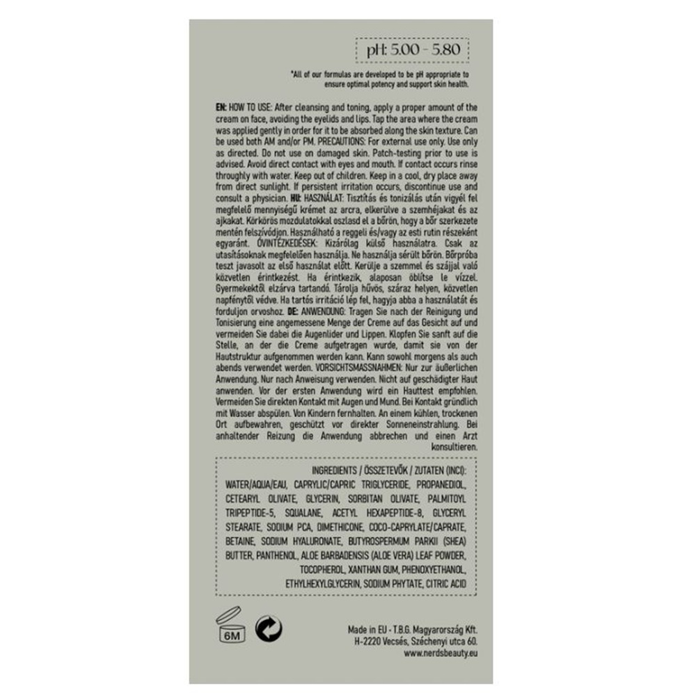 Water/Aqua/Eau, Caprylic/Capric Triglyceride, Propanediol, Cetearyl Olivate, Glycerin, Sorbitan Olivate, Palmitoyl Tripeptide-5, Squalane, Acetyl Hexapeptide-8, Glyceryl Stearate, Sodium PCA, Dimethicone, Coco-Caprylate/Caprate, Betaine, Sodium Hyaluronate, Butyrospermum Parkii (Shea) Butter, Panthenol, Aloe Barbadensis (Aloe Vera) Leaf Powder, Tocopherol, Xanthan Gum, Phenoxyethanol, Ethylhexylglycerin, Sodium Phytate, Citric Acid.
