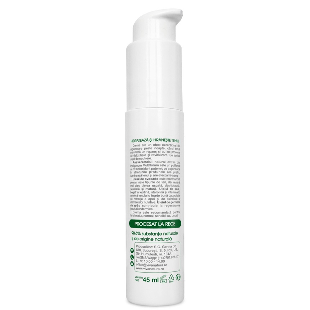 Aqua, Inulin lauryl carbamate (origine naturală), Persea gratissima oil (ulei de avocado natural), Squalane oil (natural), Oryza sativa starch (natural), Glycerin (vegetală), Phenoxyethanol, Glyceryl laurate (origine naturală), Alcohol denat. (origine naturală), Resveratrol (natural), Ethylhexyl olivate, Sodium acrylates copolymer, Polyglyceryl-4 olivate (origine naturală), Tamarindus indica fruit extract (natural), Tocopherol (natural), Glycine soja oil (ulei de soia), Salvia officinalis oil (ulei de salvie), Lavandula angustifolia oil (ulei de lavandă), Melissa officinalis leaf/ seed oil (ulei de roiniţă), Hippophae rhamnoides oil (ulei de cătină), Aloe vera callus extract (natural), Rosmarinus officinallis extract (rozmarin), Salix alba leaf extract (salcie), Lythrum salicaria extract (răchitan), Ocimum basilicum extract (busuioc), Cichorium intybus extract (cicoare), Centaurea cyanus flower extract (albăstrele), Humulus lupus extract (hamei), Trigonella foenum-graecum extract (schinduf), Achillea millefolium extract (coada şoricelului), Curcuma longa root extract (turmeric), Azadirachta indica extract (neem), Panax ginseng root extract (ginseng), Pueraria tuberosa (vidari), Boswellia serrata extract (boswellia), Centella asiatica extract (gotu kola), Hamamelis virginiana bark extract (hamamelis).