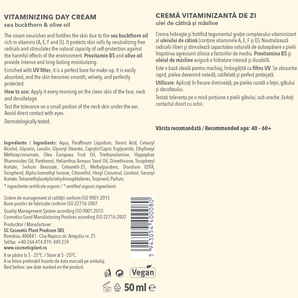 - crema vitaminizanta de zi cu ulei de catina şi masline hraneşte şi fortifica tegumentul graţie complexului vitaminizant al uleiului de catina (contine vitaminele A, E, F si D);