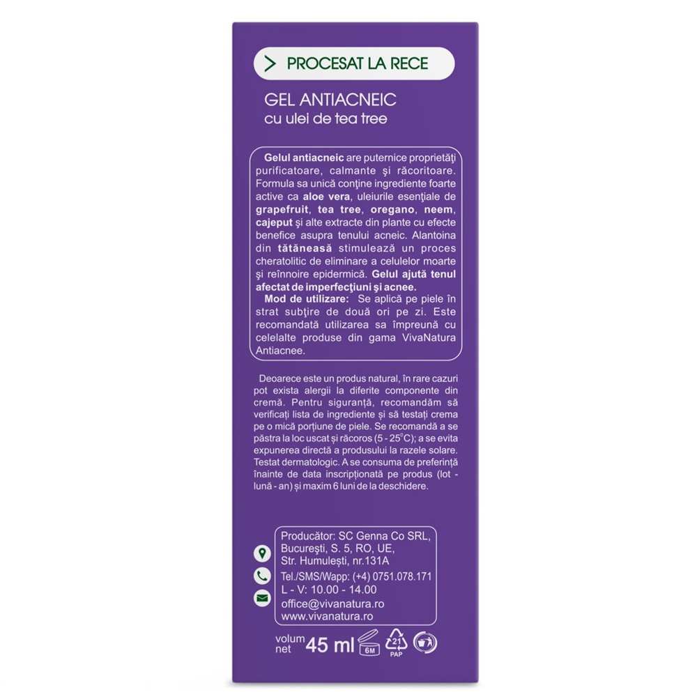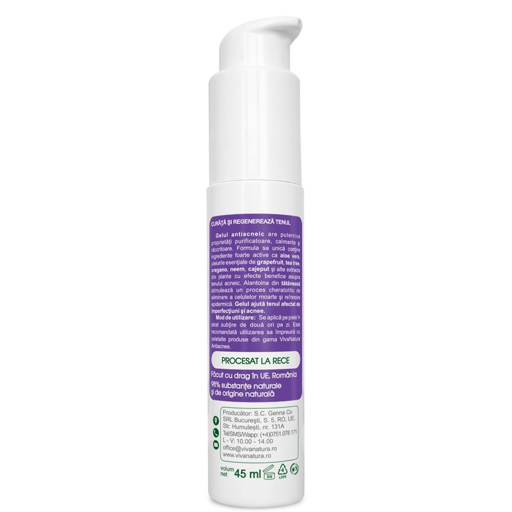 - formula sa unică conţine ingrediente foarte active cum ar fi aloe vera, alantoină, uleiurile esenţiale de grapefruit, tea tree, oregano, neem, cajeput şi extracte din plante cu efecte benefice asupra tenului acneic;