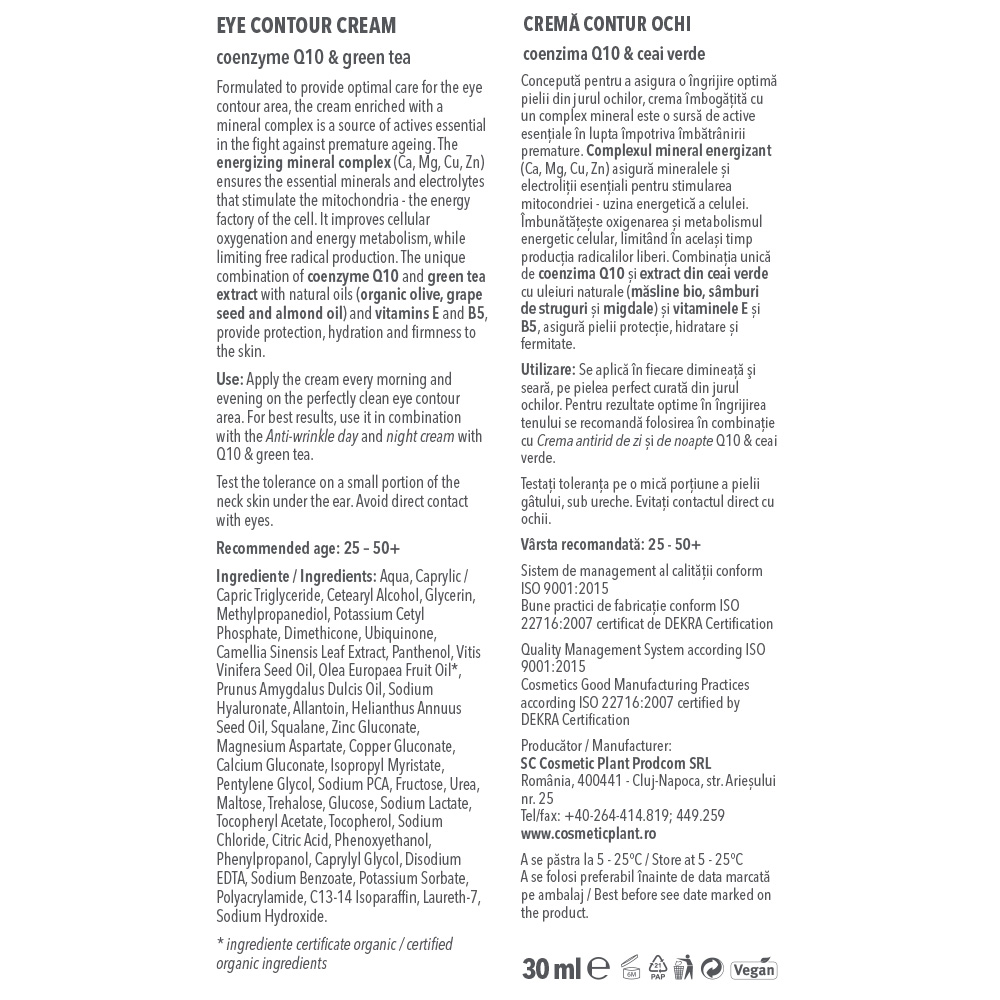 - formulata pentru a asigura o ingrijire optima a pielii din jurul ochilor, crema contur ochi Q10 si ceai verde imbogatita cu un complex mineral este o sursa de active esentiale in lupta impotriva imbatranirii premature;