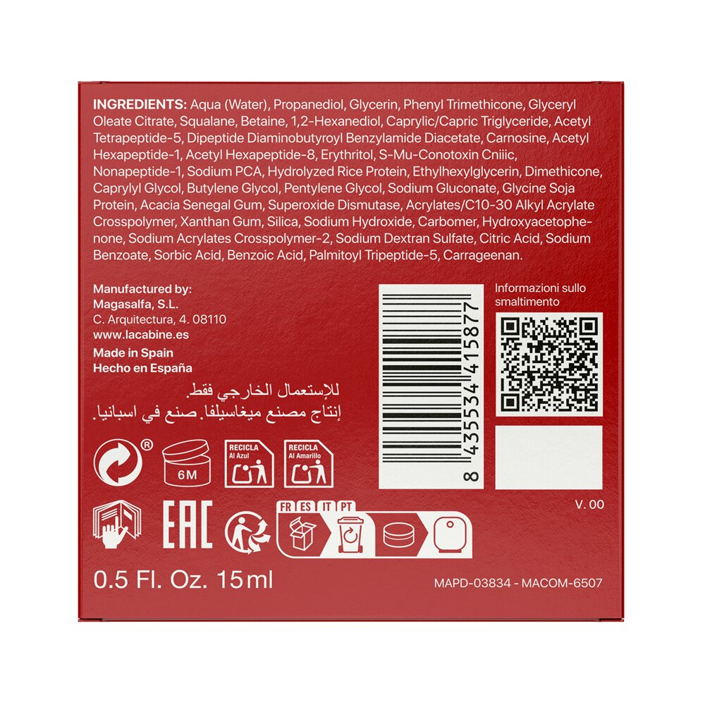 Aqua (Water), Propanediol, Glycerin, Phenyl Trimethicone, Glyceryl Oleate Citrate, Squalane, Betaine, 1,2-Hexanediol, Caprylic/Capric Triglyceride, Acetyl Tetrapeptide-5, Dipeptide Diaminobutyroyl Benzylamide Diacetate, Carnosine, Acetyl Hexapeptide-1, Acetyl Hexapeptide-8, Erythritol, S-Mu-Conotoxin Cniiic, Nonapeptide-1, Sodium PCA, Hydrolyzed Rice Protein, Ethylhexylglycerin, Dimethicone, Caprylyl Glycol, Butylene Glycol, Pentylene Glycol, Sodium Gluconate, Glycine Soja Protein, Acacia Senegal Gum, Superoxide Dismutase, Acrylates/C10-30 Alkyl Acrylate Crosspolymer, Xanthan Gum, Silica, Sodium Hydroxide, Carbomer, Hydroxyacetophenone, Sodium Acrylates Crosspolymer-2, Sodium Dextran Sulfate, Citric Acid, Sodium Benzoate, Sorbic Acid, Benzoic Acid, Palmitoyl Tripeptide-5, Carrageenan.