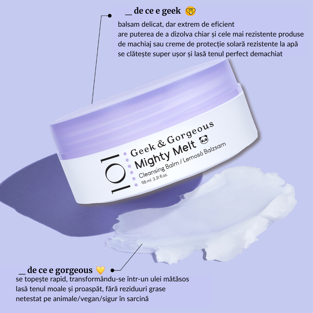 - balsam demachiant delicat și extrem de eficient, care dizolvă produsele de machiaj rezistente la apă și cremele de protecție solară de lungă durată, fără a agresa pielea, lăsând tenului o senzație de hidratare și catifelare;