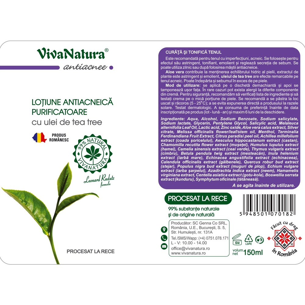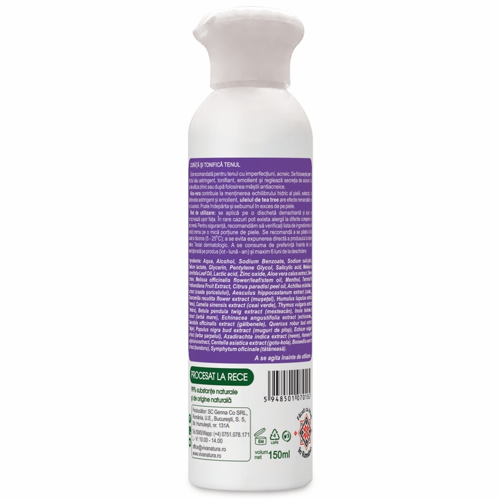 Aqua , Alcohol, Sodium Benzoate, Sodium salicylate, Sodium lactate, Glycerin, Pentylene Glycol, Salicylic acid, Melaleuca alternifolia Leaf Oil, Lactic acid, Zinc oxide, Aloe vera calus extract, Silver citrate, Melissa officinalis flower/leaf/stem oil, Menthol, Terminalia Ferdinandiana Fruit Extract, Citrus paradisi peel oil, Achillea millefolium extract (coada şoricelului), Aesculus hippocastanum extract (castan), Chamomilla recutita flower extract (muşeţel), Humulus lupulus extract (hamei), Camelia sinensis extract (ceai verde), Thymus vulgaris extract (cimbru), Betula pendula twig extract (mesteacăn), Inula helenium extract (iarbă mare), Echinacea angustifolia extract (echinaceea), Calendula officinalis extract (gălbenele), Quercus robur bud extract (stejar), Populus nigra bud extract (muguri de plop), Echium vulgare extract (iarba şarpelui), Azadirachta indica extract (neem), Hamamelis virginiana extract, Centella asiatica extract (gotu-kola), Boswellia serrata extract (kunduru).