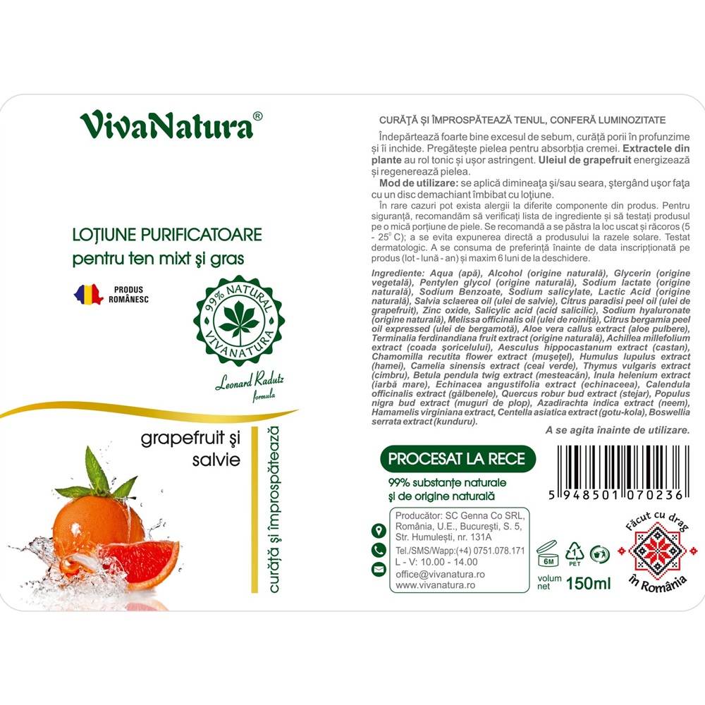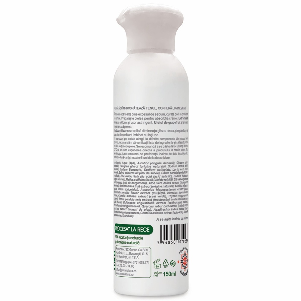 Aqua (apă), Alcohol (origine naturală), Glycerin (origine vegetală), Pentylen glycol (origine naturală), Sodium lactate (origine naturală), Sodium Benzoate, Sodium salicylate, Lactic Acid (origine naturală), Salvia sclaerea oil (ulei de salvie), Citrus paradisi peel oil (ulei de grapefruit), Zinc oxide, Salicylic acid (acid salicilic), Sodium hyaluronate (origine naturală), Melissa officinalis oil (ulei de roiniță), Citrus bergamia peel oil expressed (ulei de bergamotă), Aloe vera callus extract (aloe pulbere), Terminalia ferdinandiana fruit extract (origine naturală), Achillea millefolium extract (coada șoricelului), Aesculus hippocastanum extract (castan), Chamomilla recutita flower extract (mușețel), Humulus lupulus extract (hamei), Camelia sinensis extract (ceai verde), Thymus vulgaris extract (cimbru), Betula pendula twig extract (mesteacăn), Inula helenium extract (iarbă mare), Echinacea angustifolia extract (echinaceea), Calendula officinalis extract (gălbenele), Quercus robur bud extract (stejar), Populus nigra bud extract (muguri de plop), Azadirachta indica extract (neem), Hamamelis virginiana extract, Centella asiatica extract (gotu-kola), Boswellia serrata extract (kunduru).