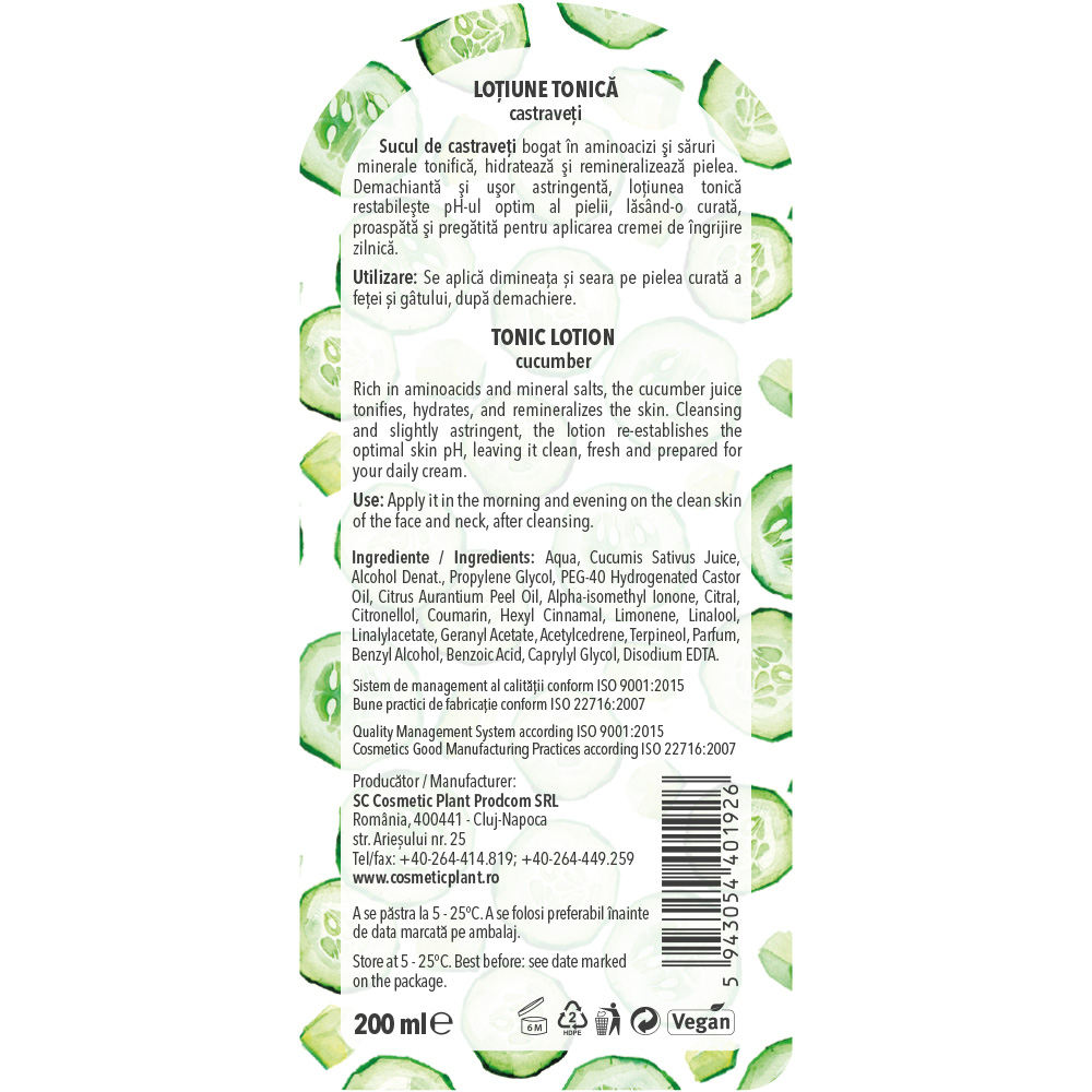 - contine suc de castraveti bogat in aminoacizi si saruri minerale, care tonifica, hidrateaza si remineralizeaza pielea;