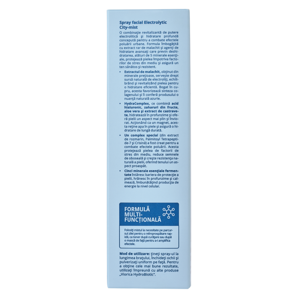 Ttineti spray-ul la lungimea bratului, inchideti ochii si pulverizati uniform pe fata. Pentru a obtine cele mai bune rezultate, utilizati impreuna cu alte produse "Viorica HydroBiotic".