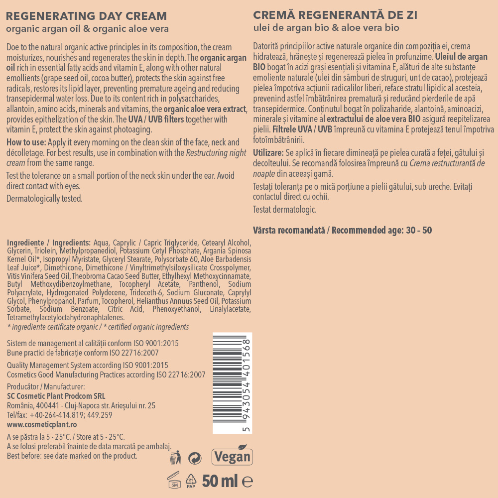 - cu principii active naturale obtinute din culturi organice, ulei de argan BIO si extract BIO de aloe vera, crema regeneranta de zi cu ulei de argan bio si extract bio de aloe vera hidrateaza, hraneste si regenereaza pielea in profunzime;