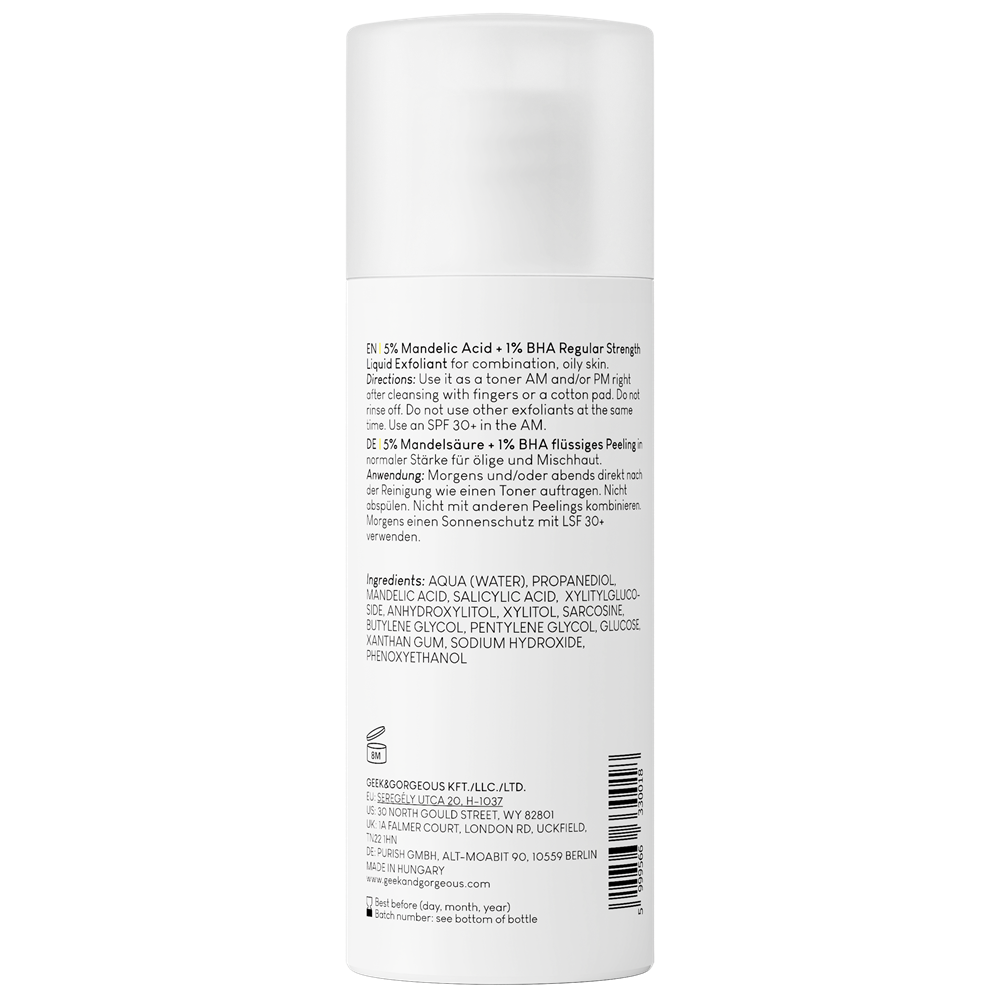 Exfoliant mediu spre puternic cu 6% Acid Mandelic + BHA menit sa ajute tenul mixt, cu actiune atat la suprafata pielii cat si la nivelul porilor, avand rolul de a curata si echilibra nivelul de sebum.