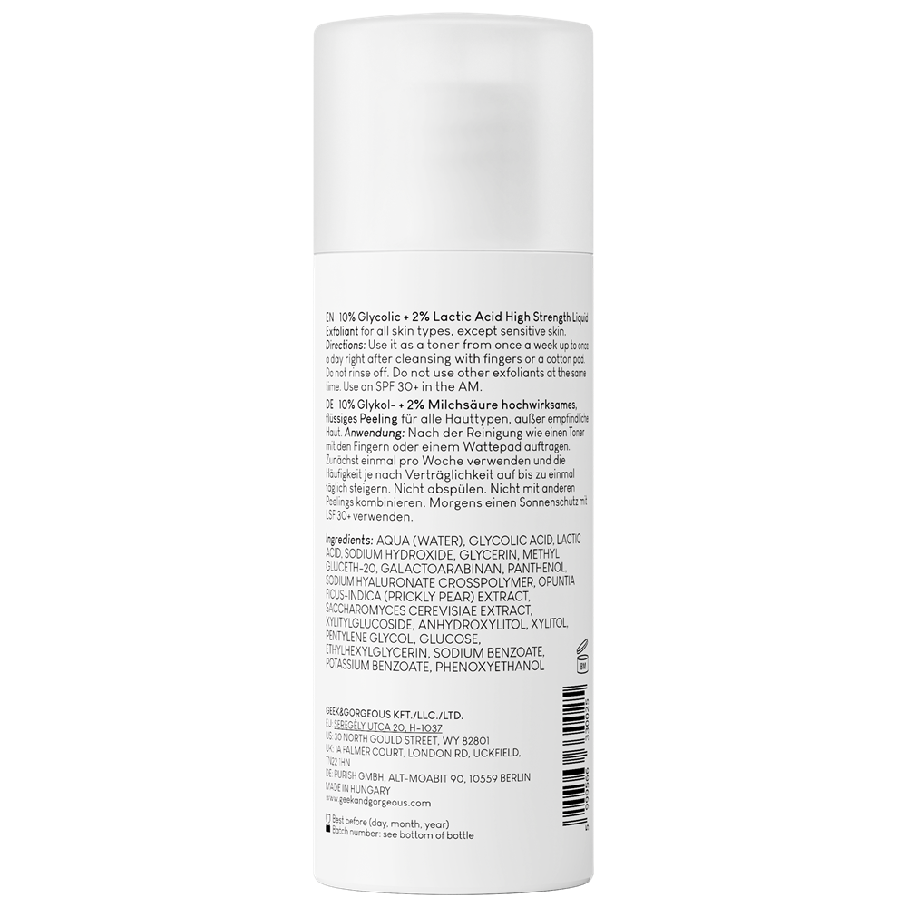 - 10% Glycolic Acid + 2% Lactic Acid;