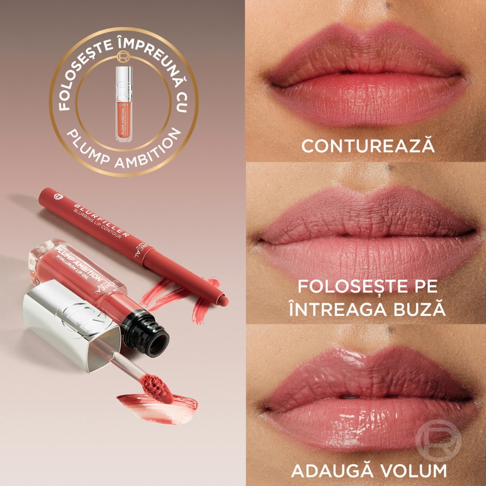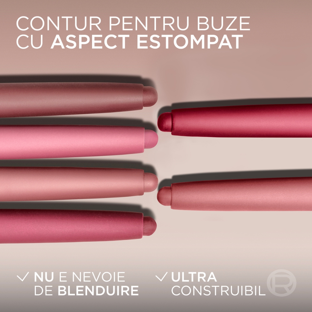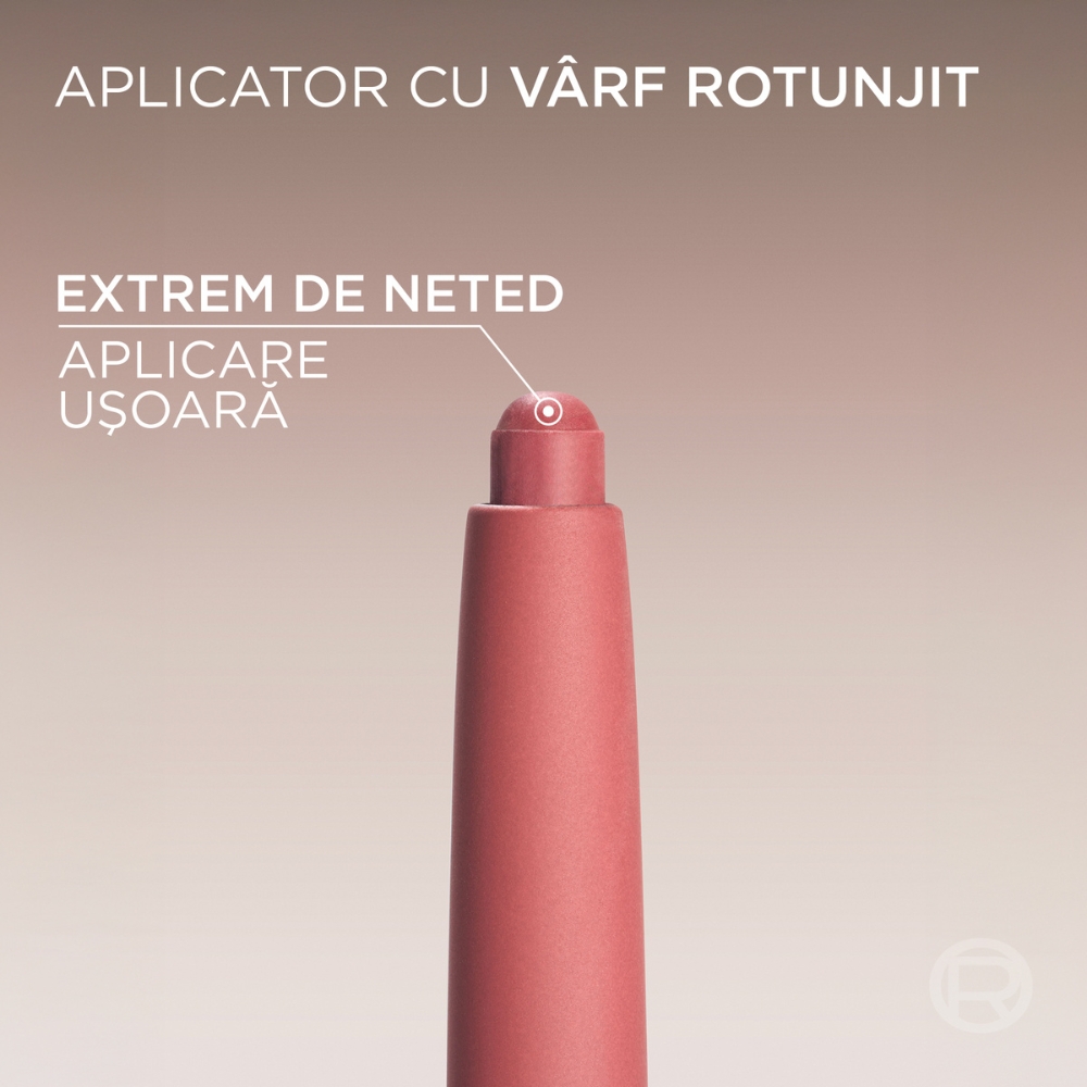 Mod de utilizare:Urmeaza conturul natural al buzelor pentru un efect usor de conturare sau umple complet interiorul buzelor, pentru un rezultat de impact. Nu este nevoie sa fie blenduit.