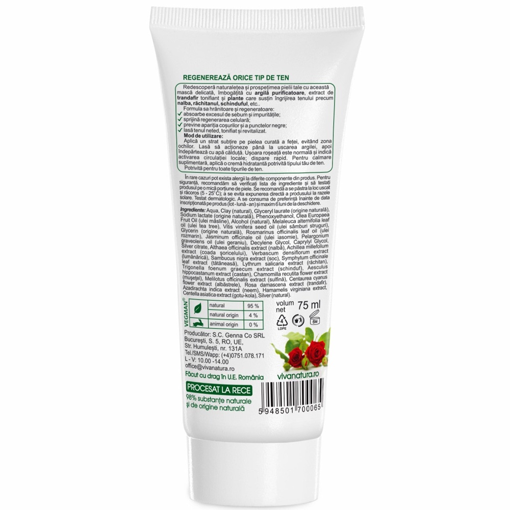 - are în compoziție argilă activă, uleiuri naturale de tea tree, geraniu, extract de trandafiri, gălbenele, nalbă mare, răchitan, tătăneasă;