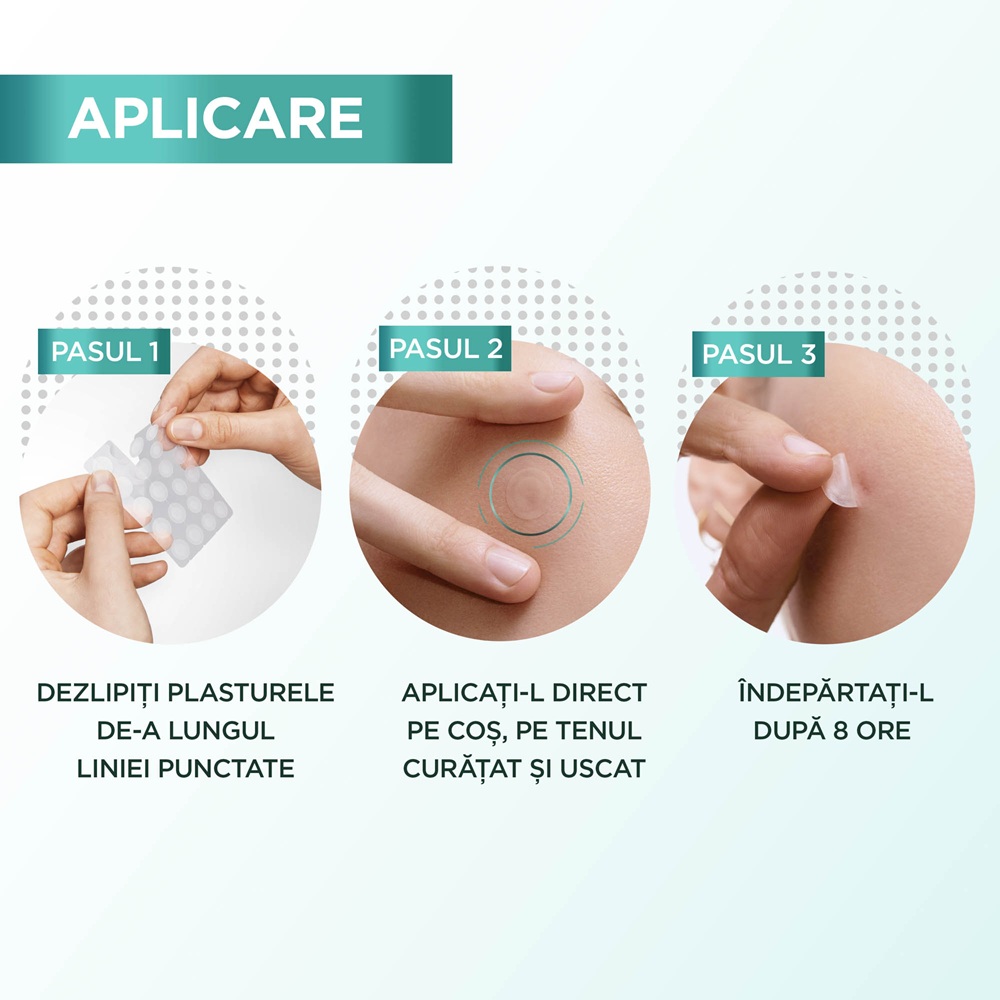 Plasturele se dezlipeste si se aplica direct pe cos, pe tenul curat si uscat.