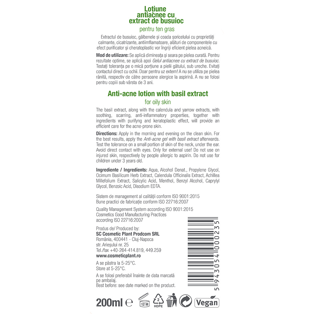 Lotiune antiacnee cu extract de busuioc, 200 ml, Cosmetic Plant