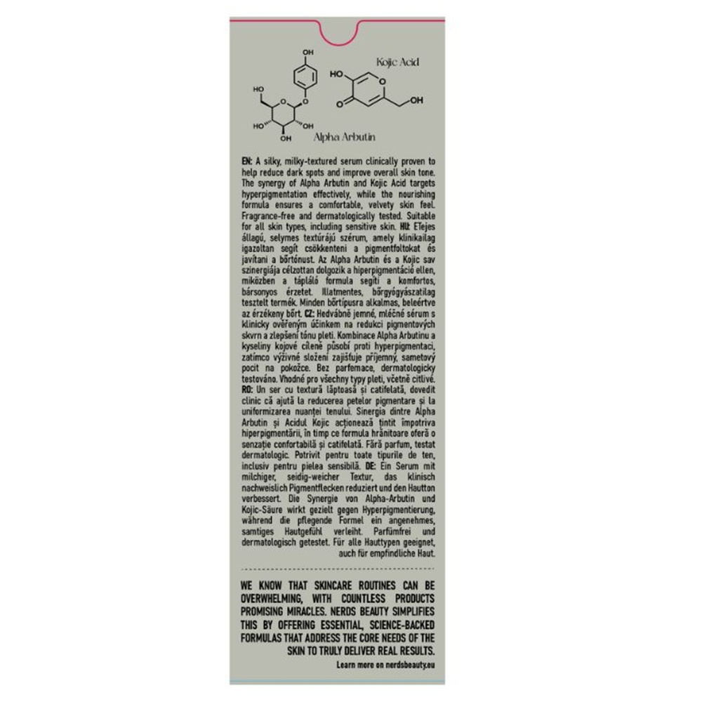 Water/Aqua/Eau, Prunus Amygdalus Dulcis (Sweet Almond) Oil, Caprylic/Capric Triglyceride, Polyglyceryl-6 Stearate, Glycerin, Coco-Caprylate/Caprate, Alpha Arbutin, Propanediol, Kojic Acid, Glyceryl Stearate, Polyglyceryl-6 Behenate, Tocopherol, Xanthan Gum, Phenoxyethanol, Helianthus Annuus (Sunflower) Seed Oil, Ethylhexylglycerin, Rosmarinus Officinalis (Rosemary) Leaf Extract, Citric Acid.
