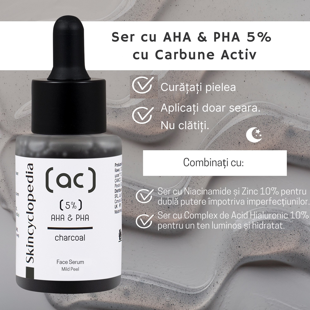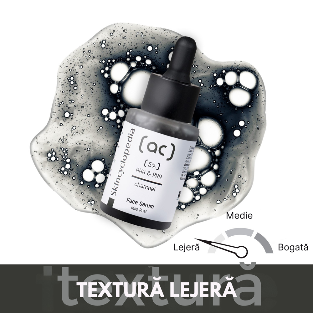 - produsul contine un complex eficient de acizi exfolianti AHA (acid mandelic) si PHA (acizi polihidroxilici), completat de carbune activ, cu rol purificator si matifiant;