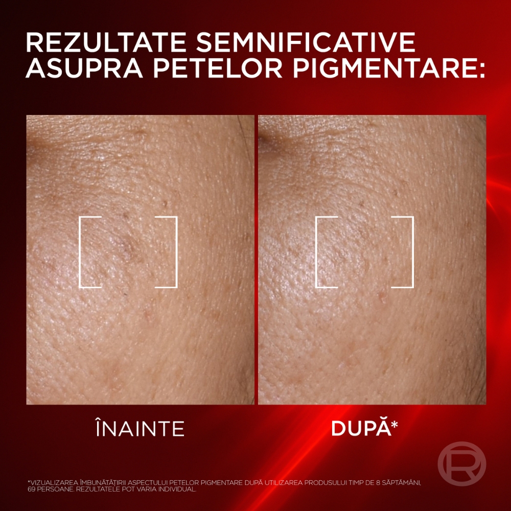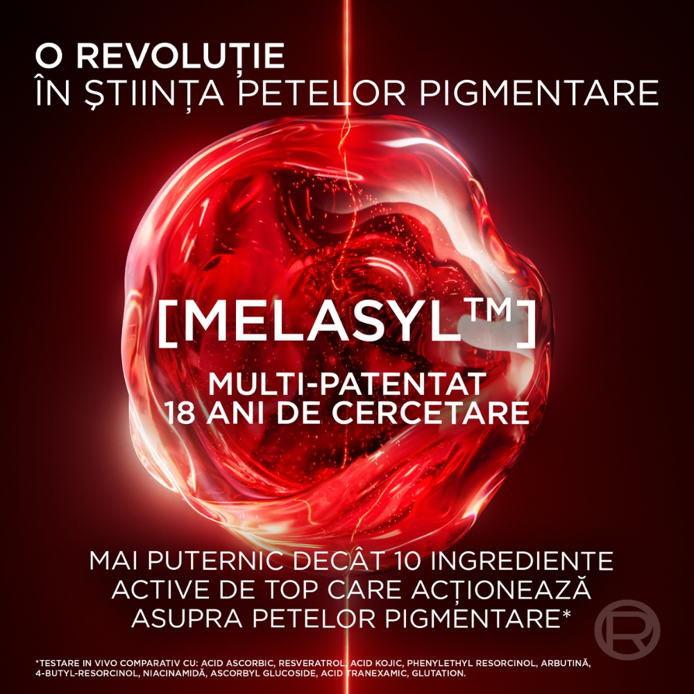 Ingrediente active:Melasyl Revolutionar, o inovatie exclusiva si cel mai puternic ingredient activ al nostru, care actioneaza asupra hiperpigmentarii. Intercepteaza melanina inainte de a aparea pe piele, oferind rezultate rapide si eficiente.