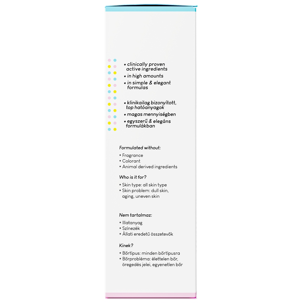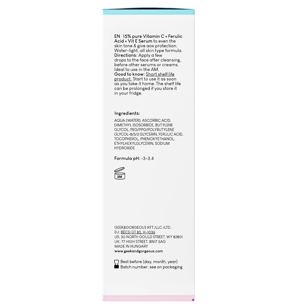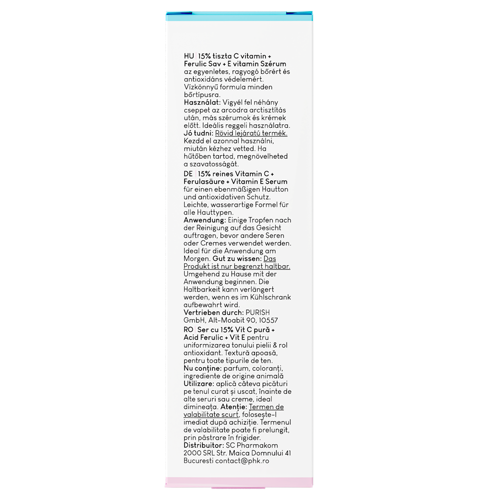 Vitamina C (acid ascorbic - 15%) - un ingredient activ dovedit clinic, care ofera pielii protectie impotriva radicalilor liberi si a poluarii mediului (antioxidant), stimuleaza productia de colagen si estompeaza hiperpigmentarea. De asemenea, ofera tenului stralucire si luminozitate instantanee.