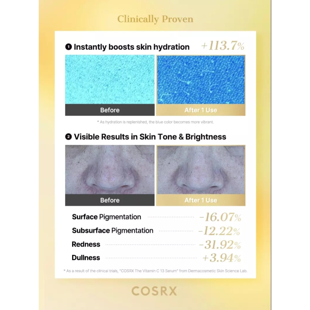 - 13% Vitamina C Pura: Imbunatateste decolorarea si nuanta neuniforma a pielii;