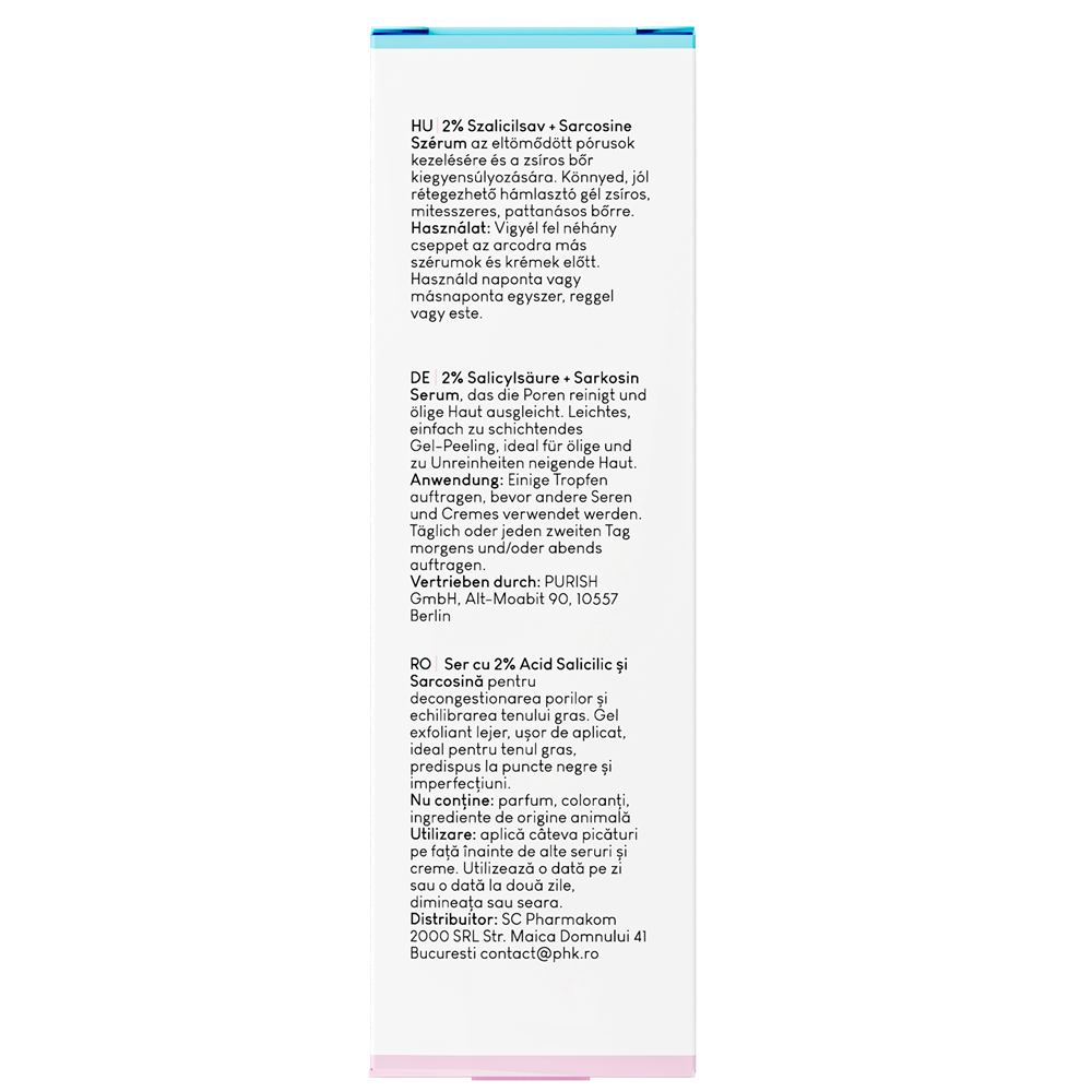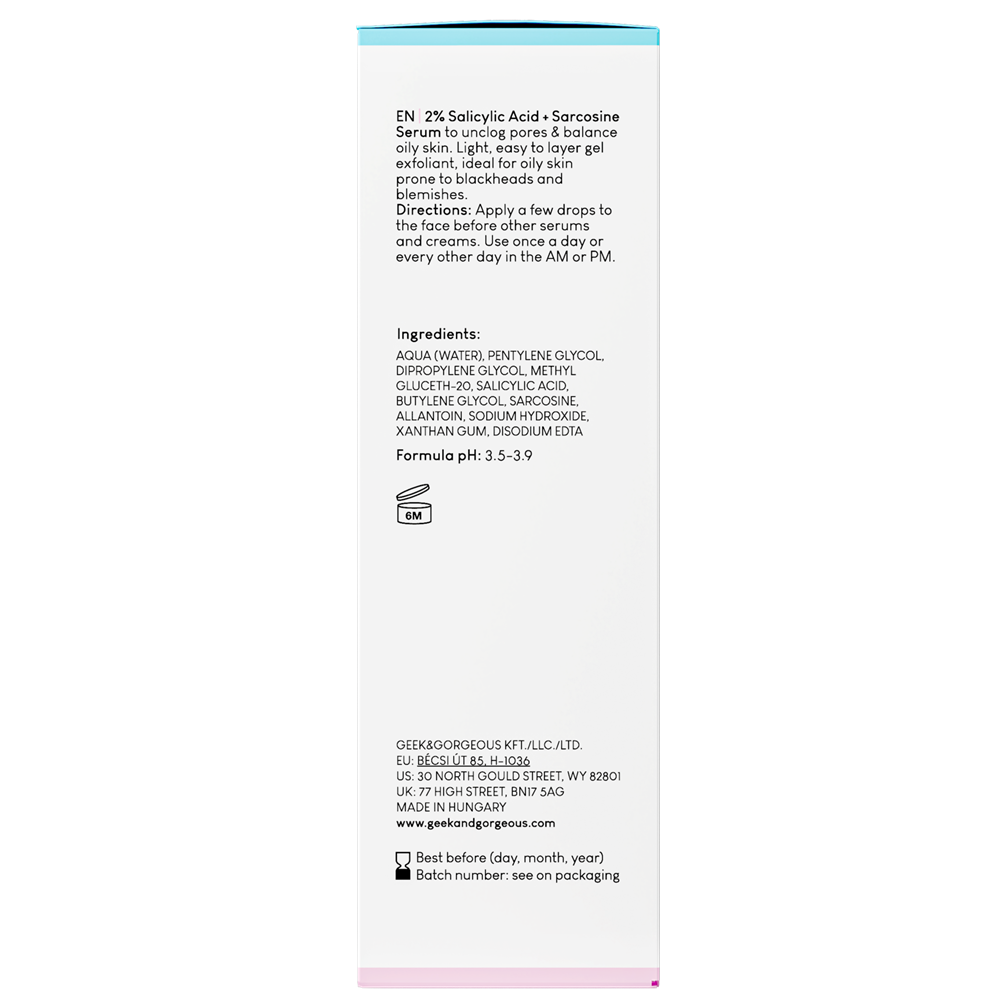 - Sarcozina isi uneste fortele cu BHA in aceasta formula pentru a rezolva problemele de ten, cum ar fi punctele negre, porii mariti si tenul gras. Este recomandat tuturor tipurilor de ten.