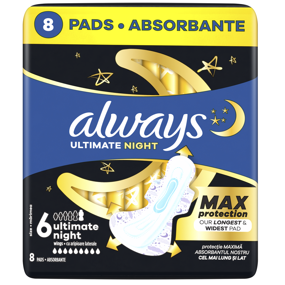 - cu aripioare si strat superior absorbant si delicat ofera protectie de pana la 12 ore, astfel incat sa poti dormi linistita, fara grija scurgerilor.