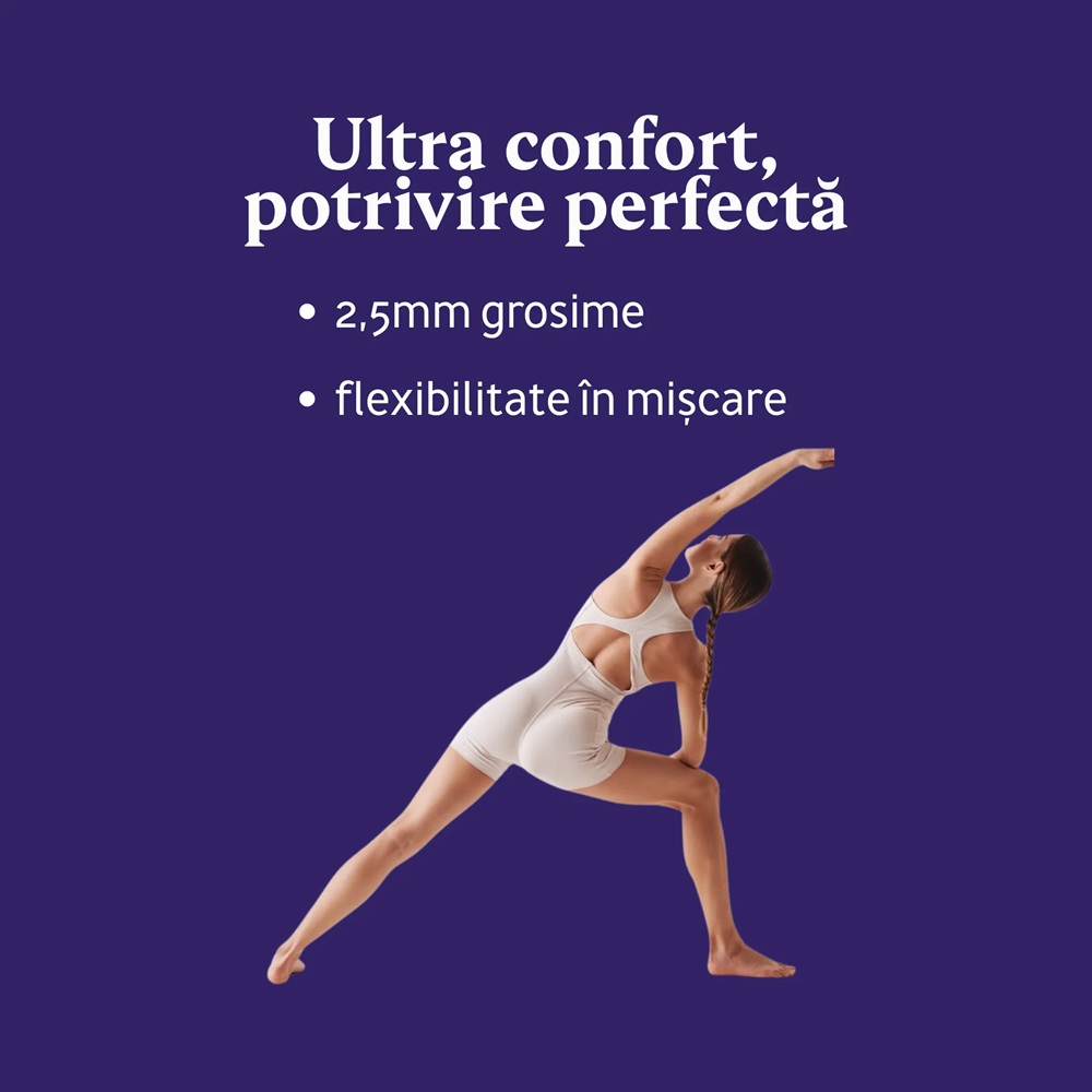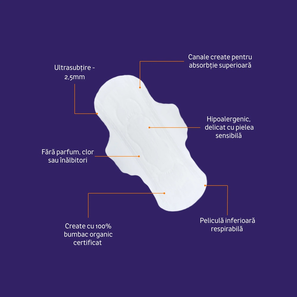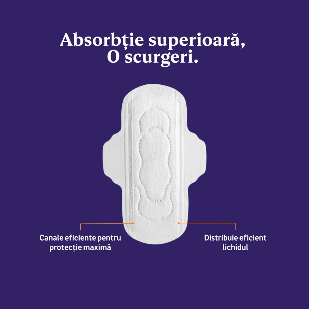 Desprinde folia protectoare, fixeaza absorbantul pe lenjerie si pliaza aripioarele sub material pentru o stabilitate perfecta.