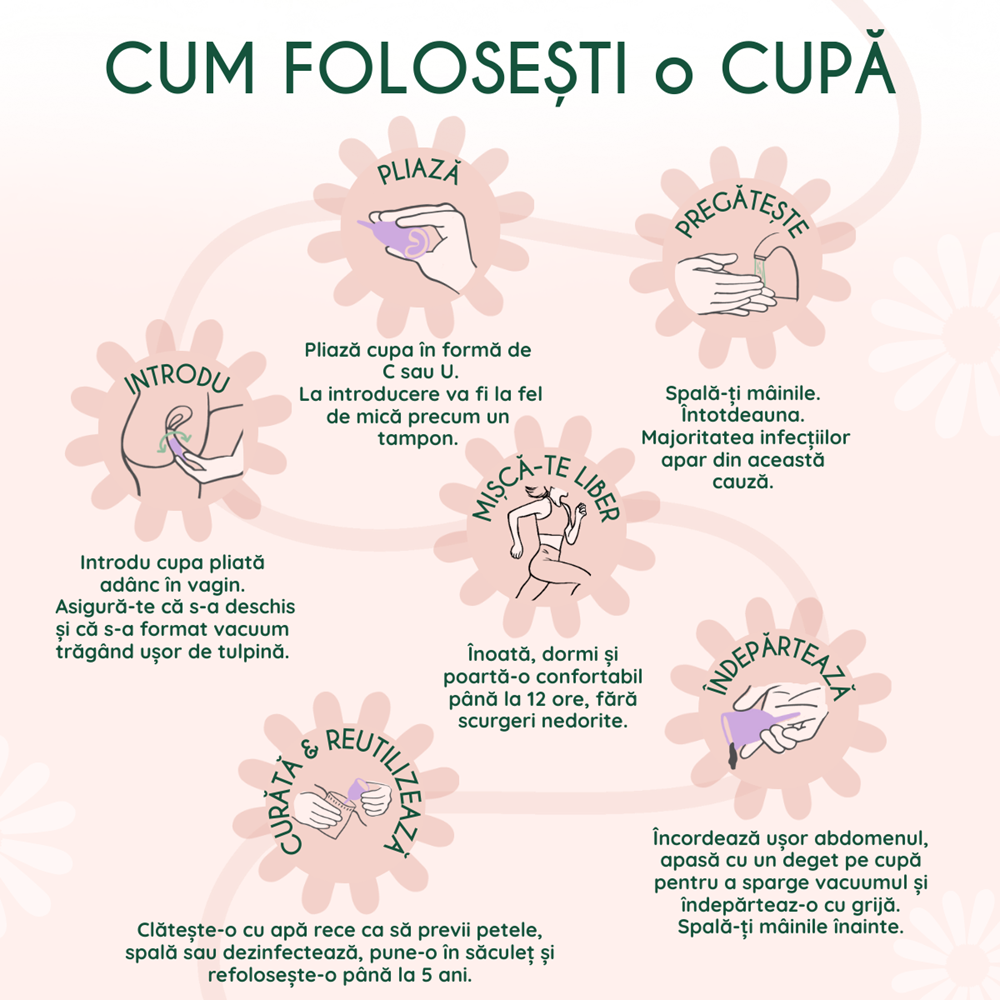 Sterilizeaza cupa inainte de prima utilizare, fierband-o timp de 3–5 minute.