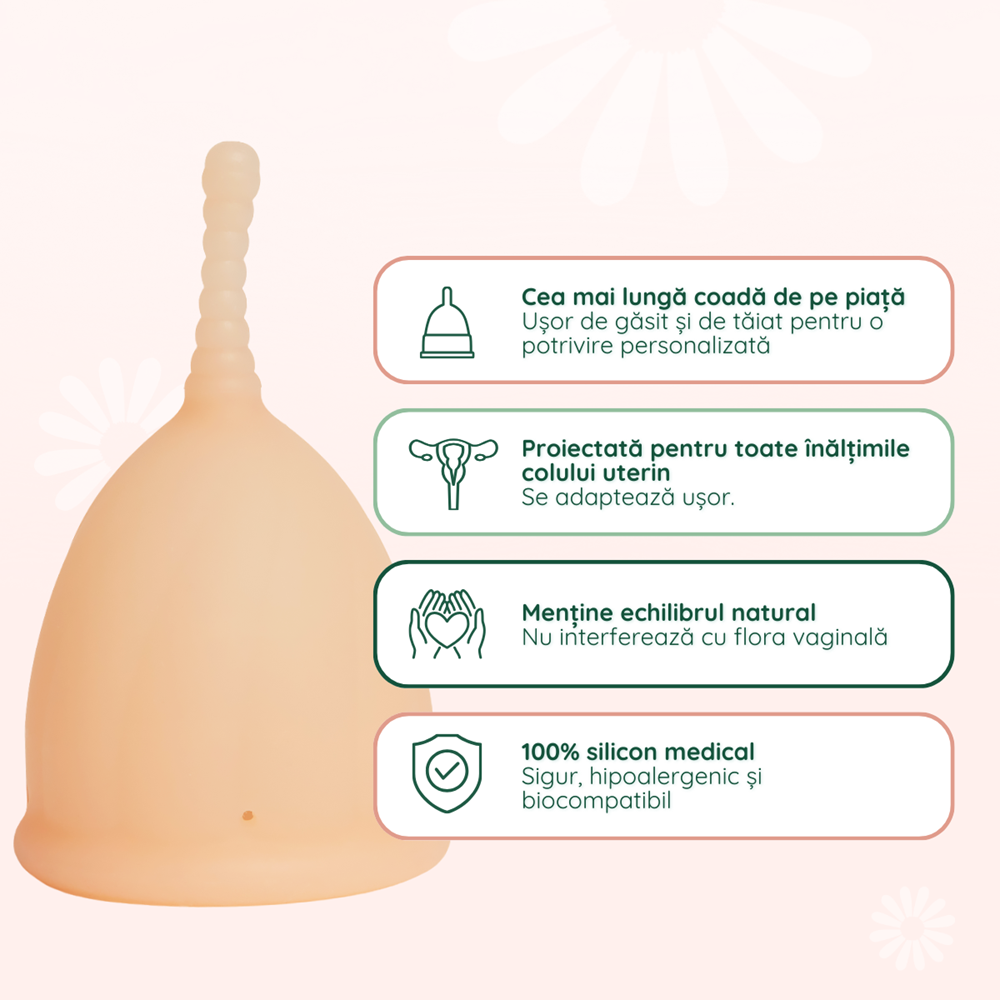 Dupa ce cupa este complet introdusa, elibereaz-o pentru a se deschide si a se sigila prin crearea unui vid delicat cu peretii vaginali.
