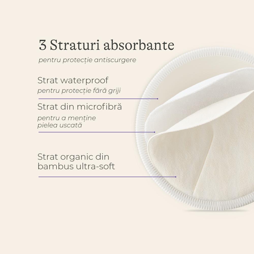 - cu un strat waterproof (impermeabil) pentru a te proteja cu incredere impotriva scurgerilor, cu un miez ultra-moale din microfibra pentru a te mentine uscata si cu un strat exterior din bambus organic pentru confort superior pe sani, care pot fi sensibili in timpul alaptarii;