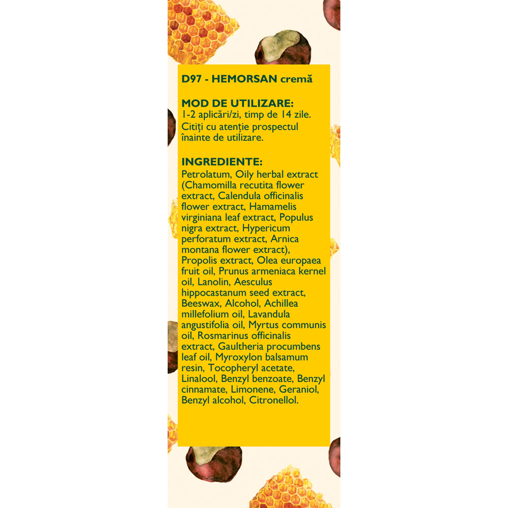Ingrediente:Petrolatum, Oily herbal extract (Chamomilla recutita flower extract, Calendula officinalis flower extract, Hamamelis virginiana leaf extract, Populus nigra extract, Hypericum perforatum extract, Arnica montana flower extract), Propolis extract, Olea europaea fruit oil, Prunus armeniaca kernel oil, Lanolin, Aesculus hippocastanum seed extract, Beeswax, Alcohol, Achillea millefolium oil, Lavandula angustifolia oil, Myrtus communis oil, Rosmarinus officinalis extract, Gaultheria procumbens leaf oil, Myroxylon balsamum resin, Tocopheryl acetate, Linalool, Benzyl benzoate, Benzyl cinnamate, Limonene, Geraniol, Benzyl alcohol, Citronellol.