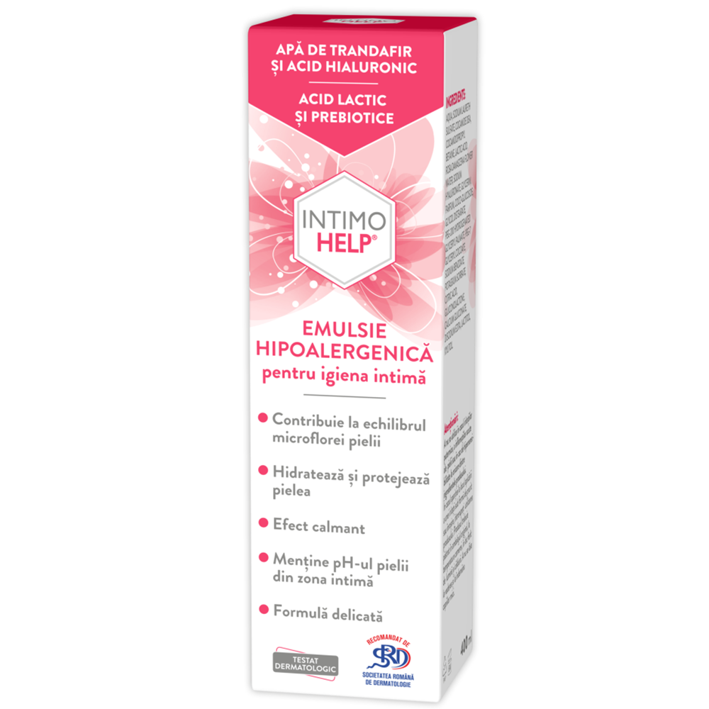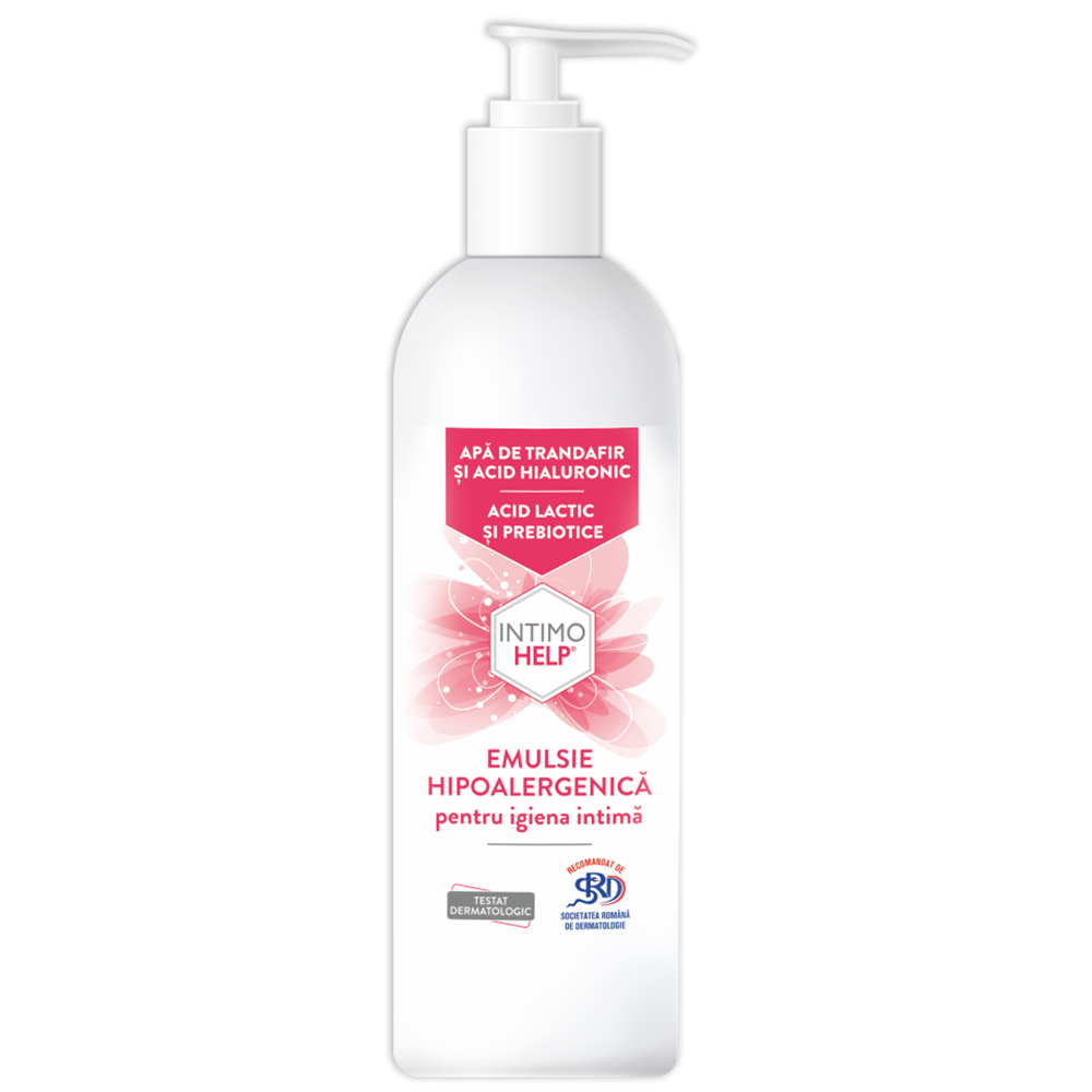 Emulsie hipoalergenică pentru igiena intimă IntimoHelp, cu apă de trandafir și acid hialuronic.