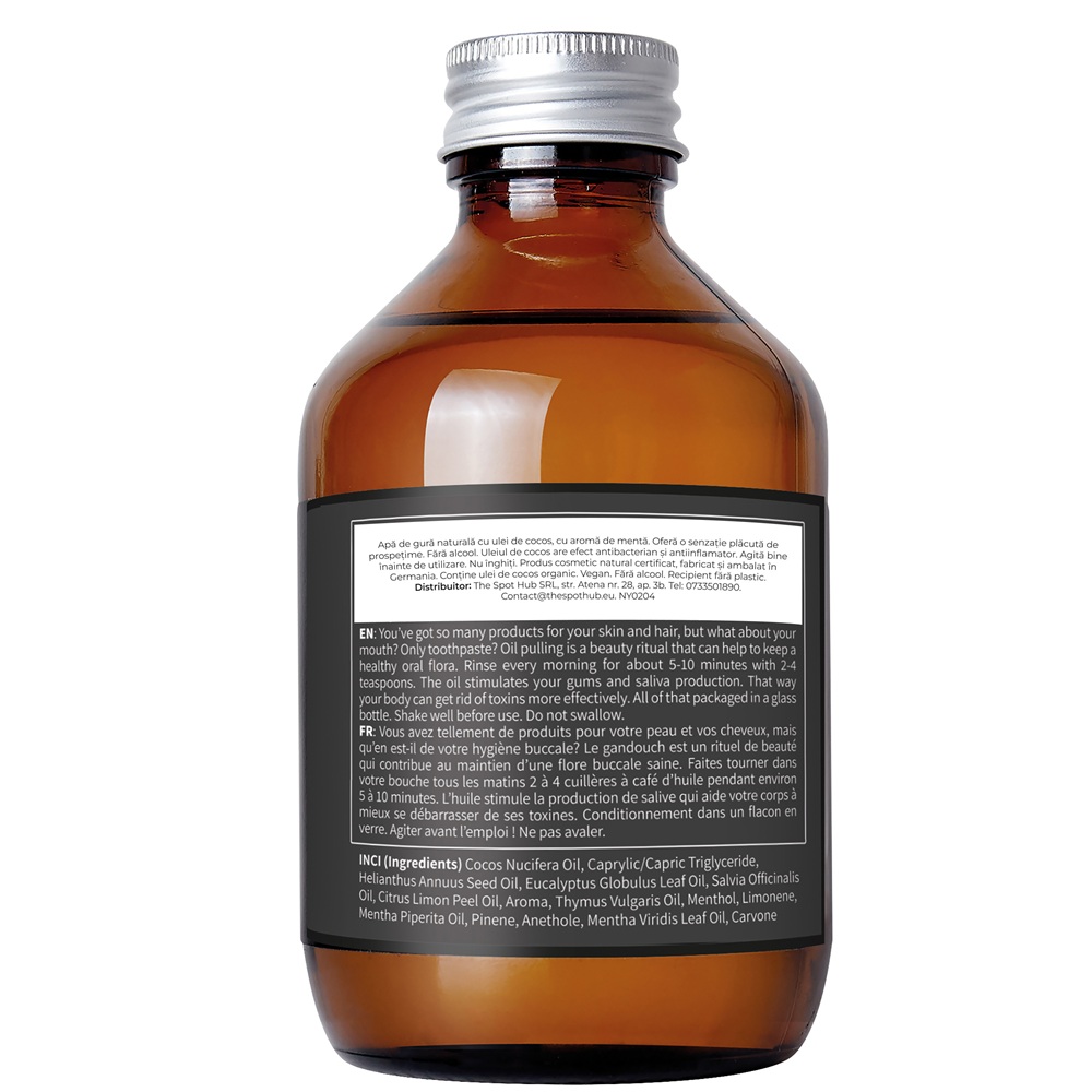 Inainte de periaj, luati 2–4 lingurite de ulei si clatiti cavitatea bucala timp de 5–10 minute, prin miscari lente.