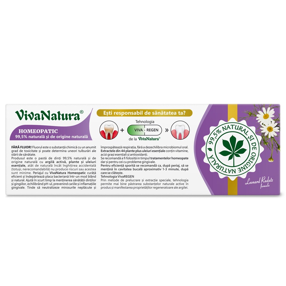 - pasta de dinti Homeopatic are o componenta complexa din plante, argila activa, propolis si aloe vera, care previn aparitia cariilor si a formarii tartrului;