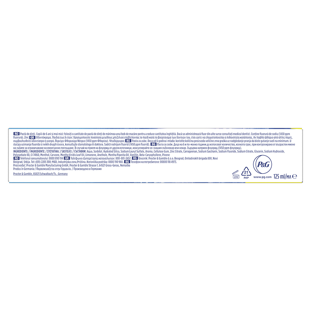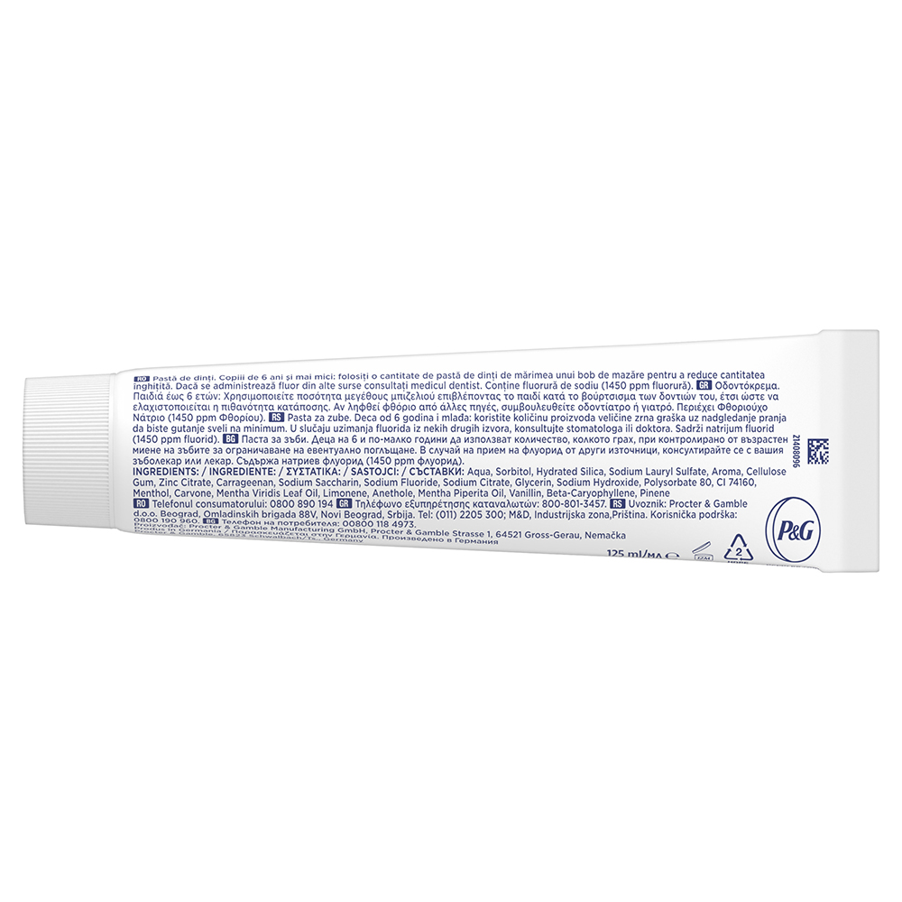 Ingrediente:Aqua, Sorbitol, Hydrated Silica, Sodium Lauryl Sulfate, Aroma, Cellulose Gum, Zinc Citrate, Carrageenan, Sodium Saccharin, Sodium Fluoride, Sodium Citrate, Glycerin, Sodium Hydroxide, Polysorbate 80, CI 74160, Menthol, Carvone, Mentha Viridis Leaf Oil, Limonene, Anethole, Mentha Piperita Oil, Vanillin, Beta-Caryophyllene, Pinene. Conţine fluorură de sodiu (1450 ppm fluorură).