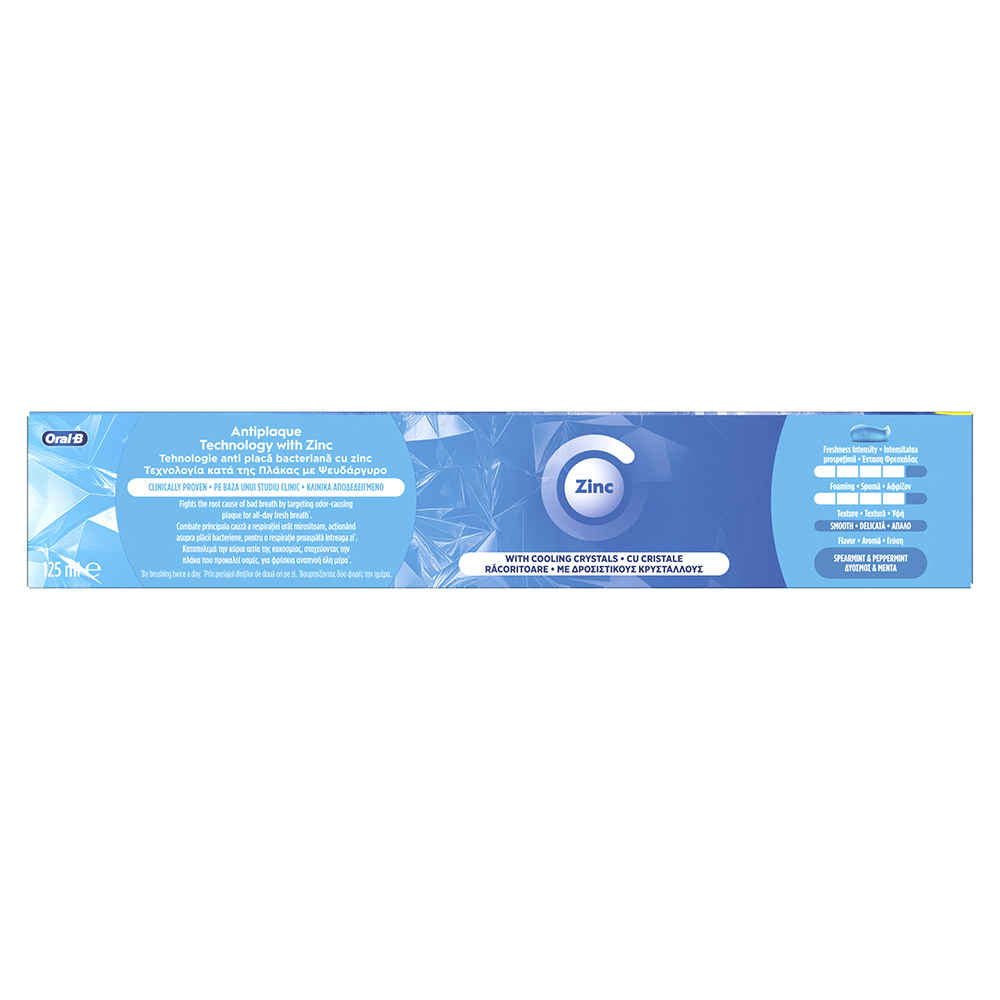 - ofera o curatare profunda si protectie dovedite clinic datorita tehnologiei antibacteriene cu zinc, care combate cauza principala a respiratiei urat mirositoare prin tintirea placii bacteriene, pentru 24 de ore de respiratie proaspata (prin periaj de doua ori pe zi);