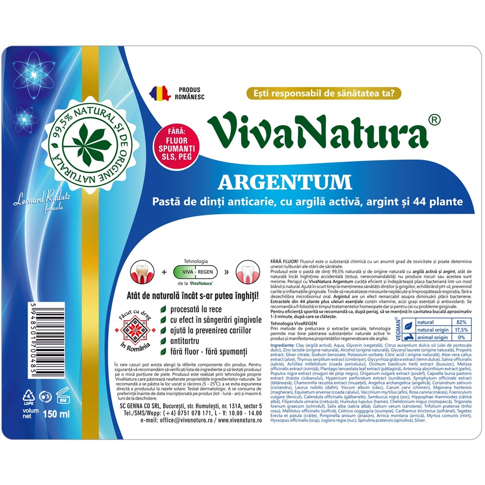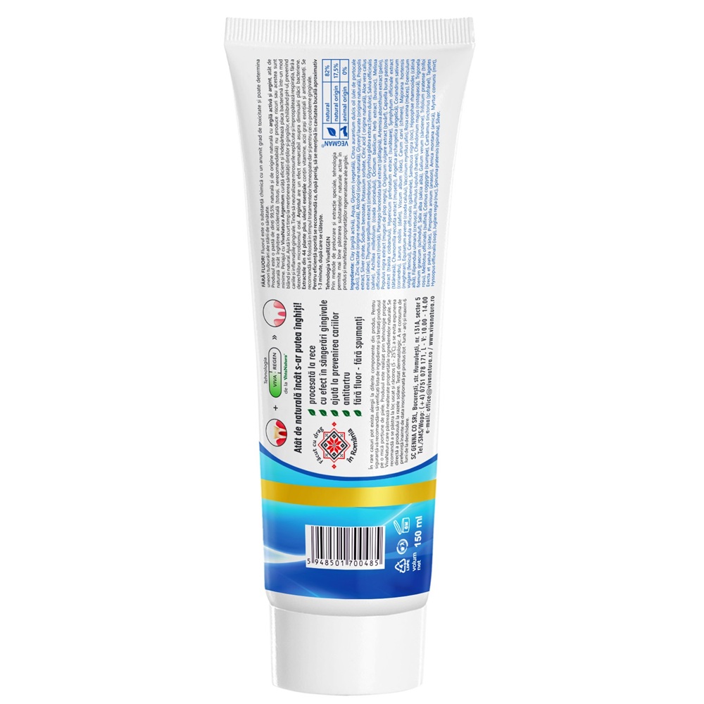 În plus, Argentum mai conține extracte din 23 de plante (rozmarin, cimbrișor, fenicul, cuișoare, scorțișoară, coada șoricelului, roiniță, busuioc, aloe vera), propolis și uleiuri vegetale, cum ar fi cele de mentă și salvie - toate acestea adăugând un plus de beneficii, având proprietăți antibacteriene și antiinflamatorii care ajută la calmarea gingiilor și la combaterea respirației urât mirositoare.